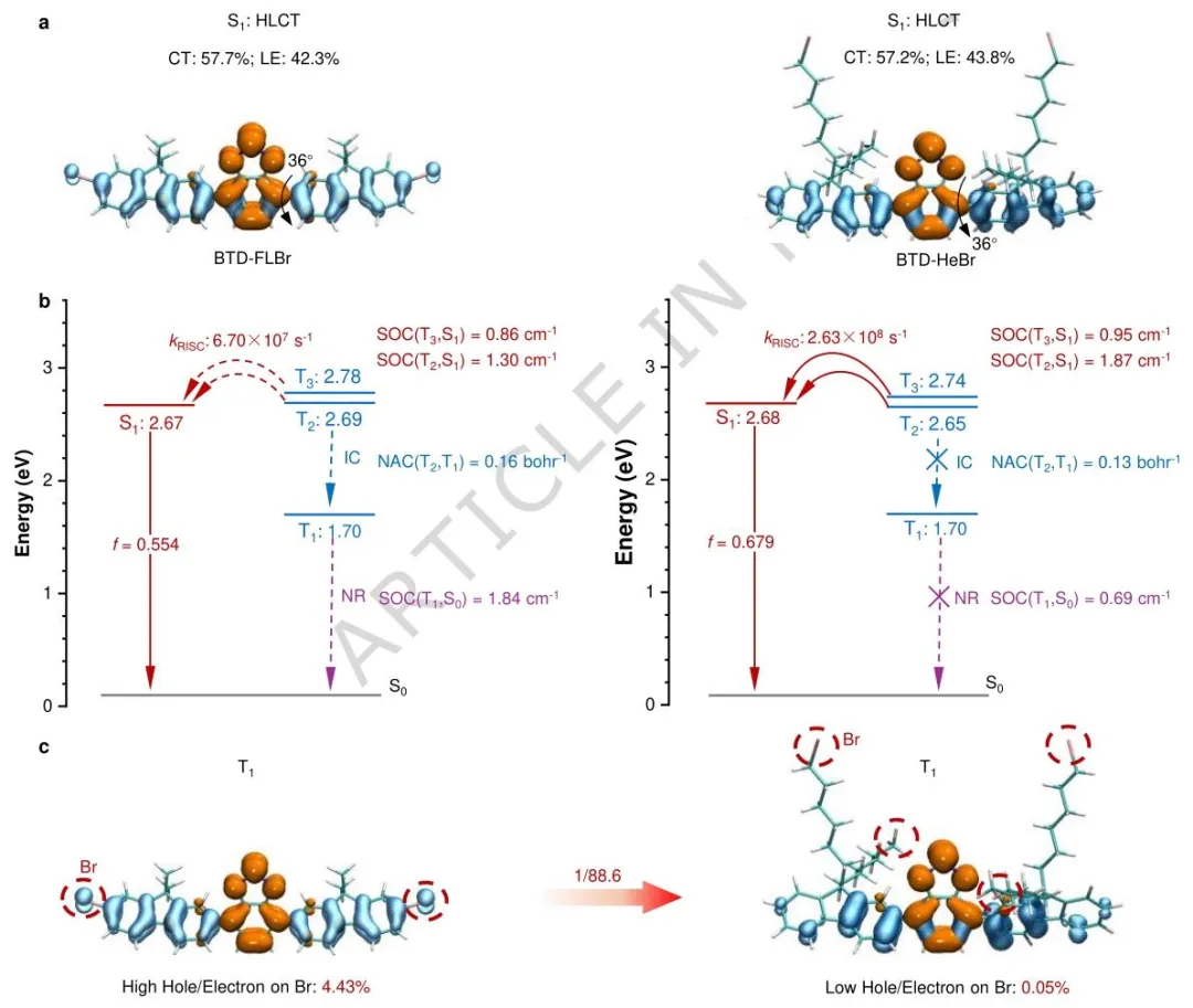 图 2、耦合与解耦溴 -π 杂化局域 - 电荷转移闪烁体激发态的理论计算。a,BTD-FLBr 和 BTD-HeBr 的 S₁态空穴和电子分布;b,杂化局域 - 电荷转移闪烁体激发态的能级和性质以及光物理过程示意图,包括三重态到单重态的反向系间窜越速率、高能三重态与单重态间的自旋 - 轨道耦合常数、T2 与 T1 间的非绝热耦合常数、T1 与 S0 间的自旋 - 轨道耦合常数;c,BTD-FLBr 和 BTD-HeBr 的 T1 态空穴和电子分布。(kRISC = 反向系间窜越速率常数;IC = 内转换;NAC = 振动非绝热耦合;SOC = 自旋 - 轨道耦合)