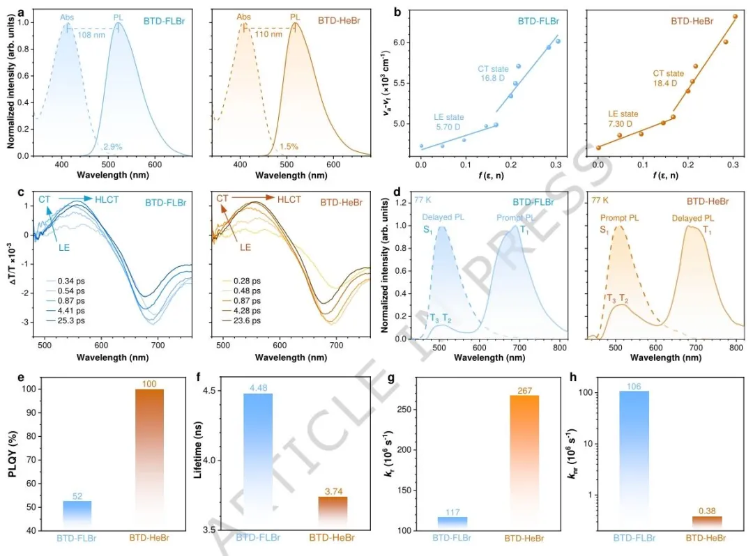 图 3、耦合与解耦溴 -π 杂化局域 - 电荷转移闪烁体的光物理性质。a,BTD-FLBr 和 BTD-HeBr 在 10⁻⁵ M 甲苯溶液中的紫外 - 可见吸收和光致发光光谱;b,二者的斯托克斯位移与溶剂极性的线性关系;c,二者在四氢呋喃溶液中的时间分辨瞬态吸收光谱;d,二者在 77 K 下的瞬态光致发光光谱和延迟光致发光光谱(延迟时间:1 ms);e,二者在纯薄膜中的光致发光量子产率;f,二者的光致发光衰减寿命;g,二者在纯薄膜中的辐射跃迁速率;h,二者在纯薄膜中的非辐射跃迁速率。