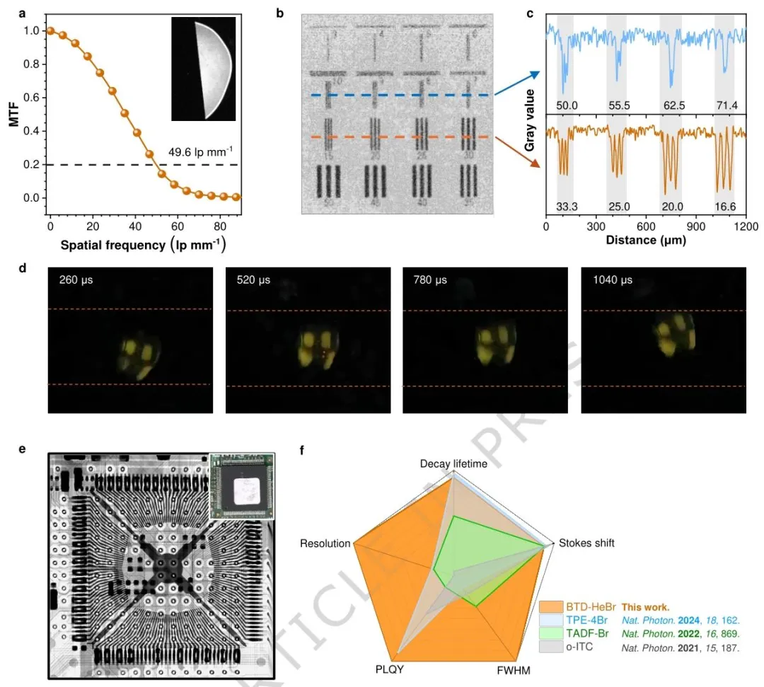 图 5、基于 BTD-HeBr 闪烁体的高分辨率 X 射线成像。a,X 射线斜边缘图像的调制传递函数分析显示,BTD-HeBr 闪烁屏的空间分辨率达 49.6 lp mm⁻¹(插图为斜边缘图像);b,微分辨率测试卡的 X 射线成像(X 射线管电压:50 kV,剂量率:2.023 mGy s⁻¹),测试卡上的数字(3-50,单位:μm)对应空间分辨率,转换为面板 c 中的线对每毫米数值;c,从微分辨率测试卡 X 射线成像中提取的青色和绿色线条的灰度值分布;d,3840 帧 / 秒高速拍摄的旋转风扇叶片 X 射线成像(尺寸:3.0×3.0 cm),展示了 260 μs、520 μs、780 μs、1040 μs 四个连续帧的成像效果;e,电子芯片在 X 射线辐照前后的明场和暗场照片(尺寸:2.5×2.5 cm,厚度:~200 μm,X 射线管电压:50 kV,剂量率:2.023 mGy s⁻¹);f,本研究的 BTD-HeBr 与典型的室温磷光闪烁体(TPE-4Br)、热激活延迟荧光闪烁体(TADF-Br)、热激子闪烁体(o-ITC)在衰减寿命、斯托克斯位移、半高宽、光致发光量子产率、空间分辨率五个维度的性能对比。