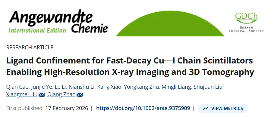 一维链状碘化亚铜簇合物因 X 射线吸收能力强、骨架稳定、光稳定性优异,成为极具潜力的闪烁体候选材料,但其发光效率远低于零维同类材料。本研究提出配体限域策略,利用位阻调控、电子调谐的嘧啶类桥联配体,同步提升一维碘化亚铜簇闪烁体的 X 射线激发发光性能并加快其衰减动力学。刚性致密的双齿配体既增强了结构刚性,又减少有机组分占比以提升 X 射线吸收效率;不对称取代基则实现空间与电子的耦合限域,形成类量子线电子态,促进辐射跃迁。最终,CuI (4-Mepym) 的光致发光量子产率较 CuI (2-Mepym) 提升 6 倍,衰减寿命仅 1.28 μs,性能优于多数已报道的碘化亚铜簇合物。该材料兼具高稳定性、良好的溶液加工性,光产额与商用 LuAG:Ce 相当(~25000 ph MeV⁻¹),突破了传统亮度 - 速度的权衡关系,可实现分辨率大于 20 lp mm⁻¹ 的高分辨率静态成像、无伪影动态 X 射线成像及高保真三维断层扫描。本研究确立了配体限域策略为开发高亮度、快衰减一维碘化亚铜簇闪烁体的有效设计原则,为先进 X 射线成像应用提供了新方向。