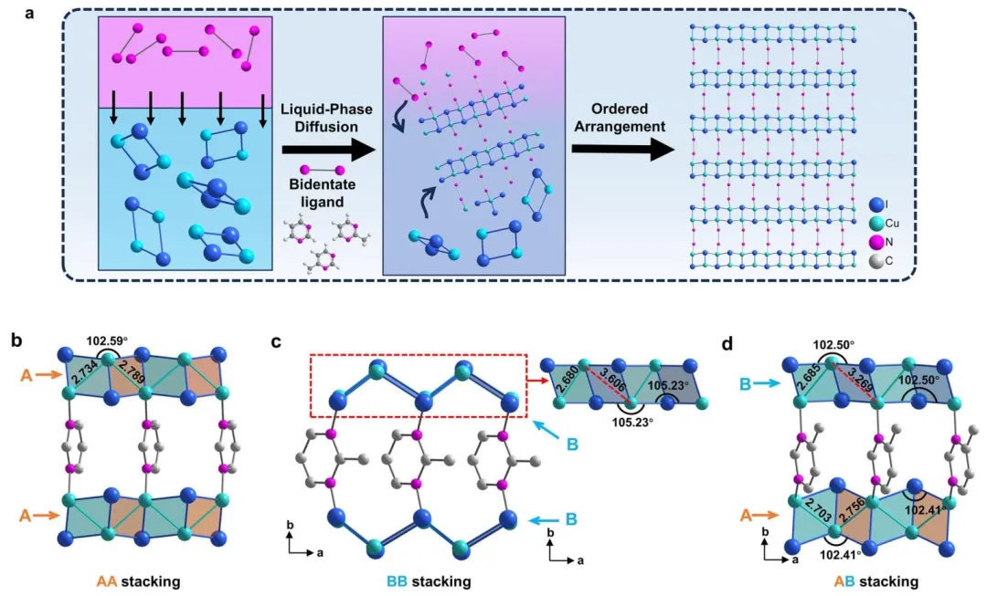 图 1、三种复合物的合成及结构表征,展示链状碘化亚铜簇合物的设计策略(a)以及 CuI (Pym)(b)、CuI (2-Mepym)(c)、CuI (4-Mepym)(d)的结构及关键参数(为清晰展示,氢原子已省略)。