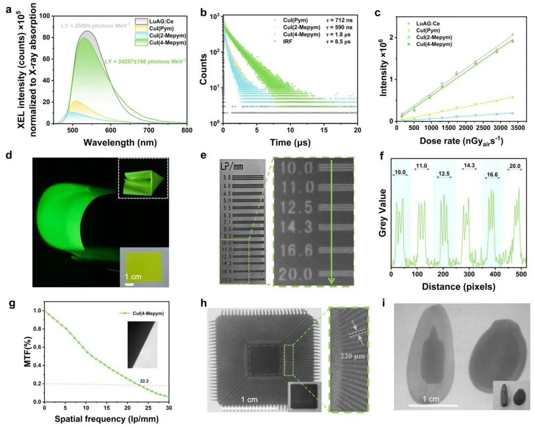 图 3、三种复合物的闪烁性能。(a)CuI (Pym)、CuI (2-Mepym)、CuI (4-Mepym) 和 LuAG:Ce 的 X 射线激发发光光谱;(b)复合物在 X 射线激发下的发光衰减曲线;(c)CuI (Pym)、CuI (2-Mepym)、CuI (4-Mepym) 和 LuAG:Ce 的 X 射线激发发光强度随 X 射线剂量率的线性响应关系;(d)柔性 CuI (4-Mepym)/ 聚乙烯醇复合膜在自然光和紫外光照射下,弯折、扭转力学形变过程中的数码照片;(e)利用 CuI (4-Mepym)/ 聚乙烯醇薄膜对标准分辨率测试板拍摄的明场(左)和对应的 X 射线(右)图像;(f)图 e 中红色虚线处的灰度强度分布曲线;(g)利用斜缘法得到的 CuI (4-Mepym)/ 聚乙烯醇薄膜的调制传递函数曲线,插图为 1 mm 厚钨片锐边的 X 射线图像;(h)集成电路板、(i)瓜子的光学和 X 射线对比图像。