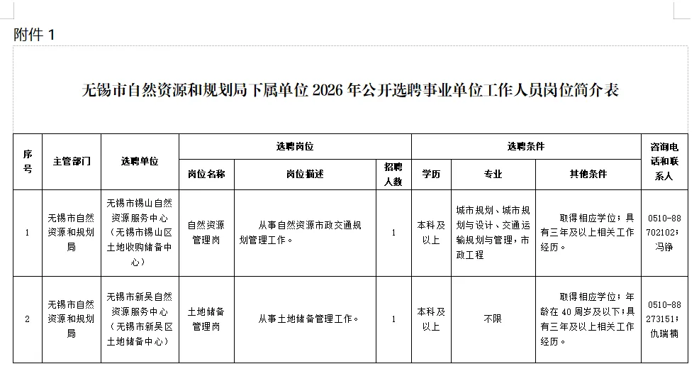 《无锡市自然资源和规划局下属单位2026年公开选聘事业单位工作人员报名表》一份(附件2),下载填写后A4正反打印并亲笔签名)(提交电子版和签名扫描版)。