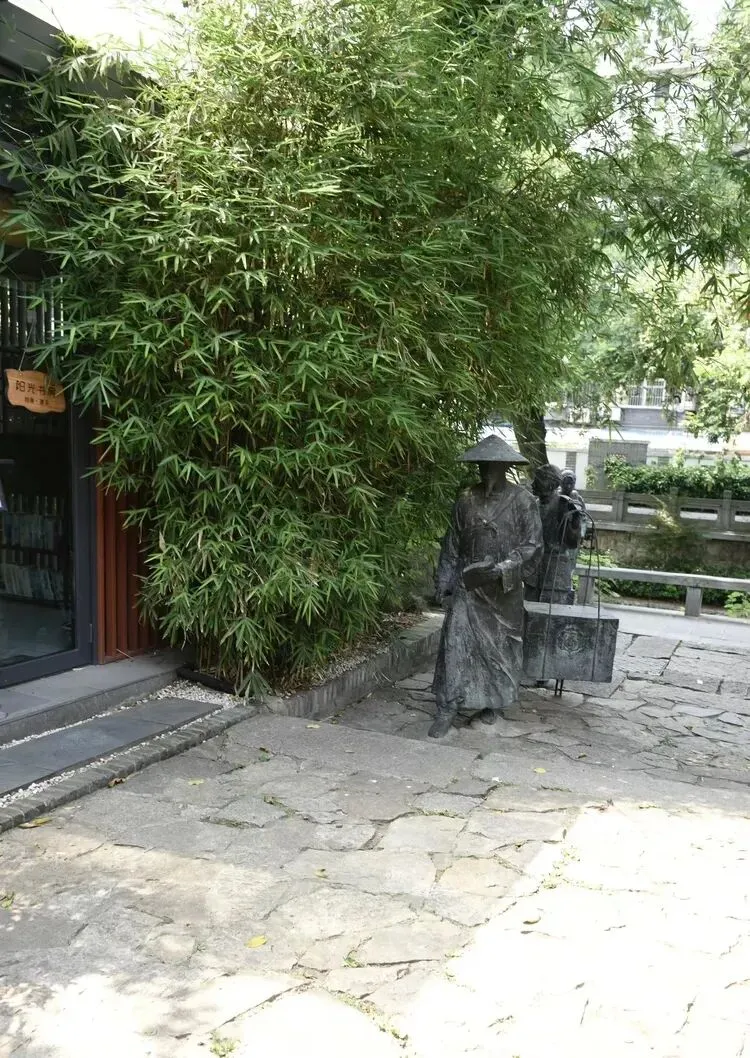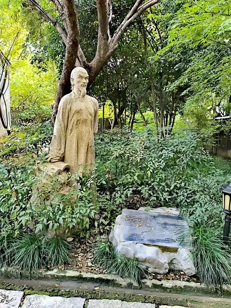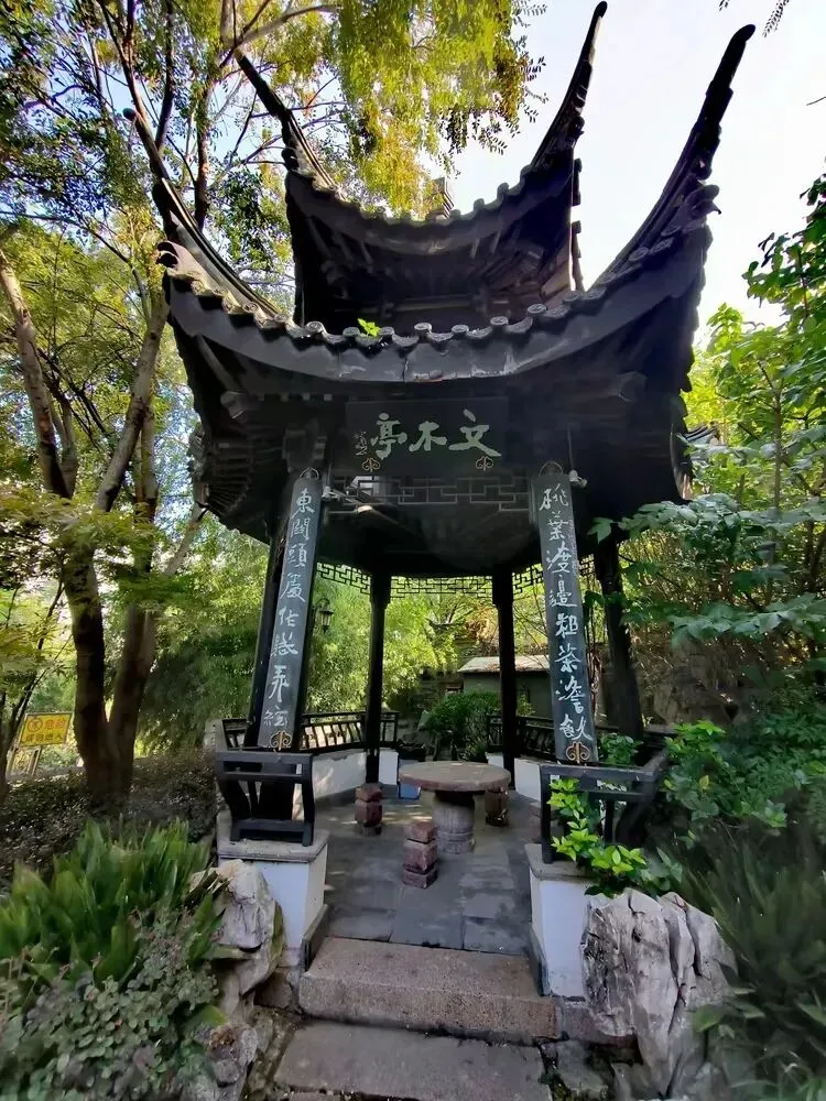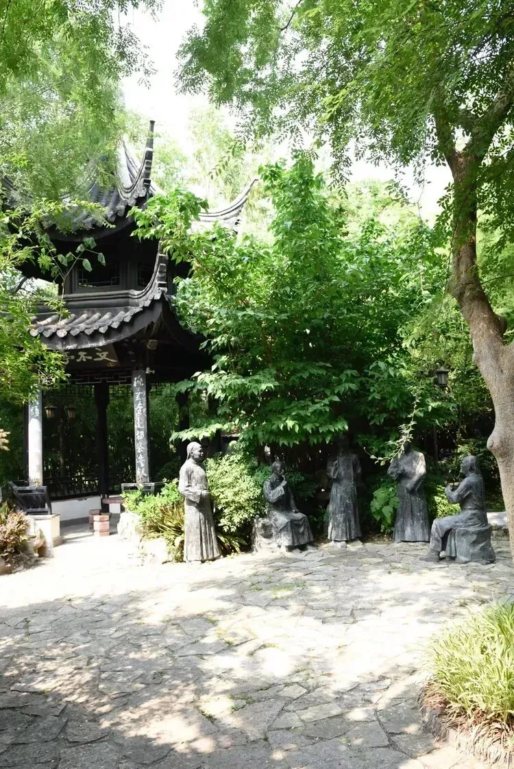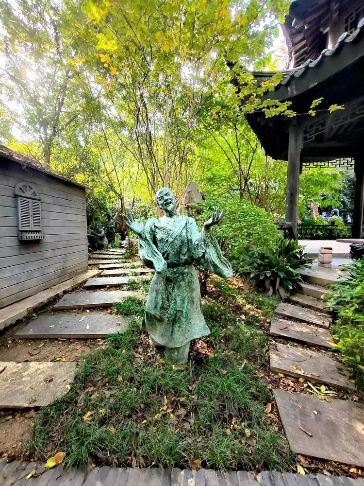 东院(文木亭+竹林曲径)文木亭。亭名取自吴敬梓晚年自号“文木老人”,也源于他的诗集《文木山房集》。这是一座典型的江南园林风格亭子,飞檐翘角,古朴典雅。亭内设有石桌石凳,供游人休憩。亭柱上悬挂着楹联,“桃叶渡边,粗茶淡饭;东关头处,作赋弄弦”。其中一副为吴敬梓的名句“有瑰意与琦行,无捷径以窘步”,体现了他高洁的品格与不随波逐流的人生态度。亭的另一旁,有《儒林外史》中范进中举的一组雕塑,栩栩如生,将范进中举后的失态描绘得十分逼真!