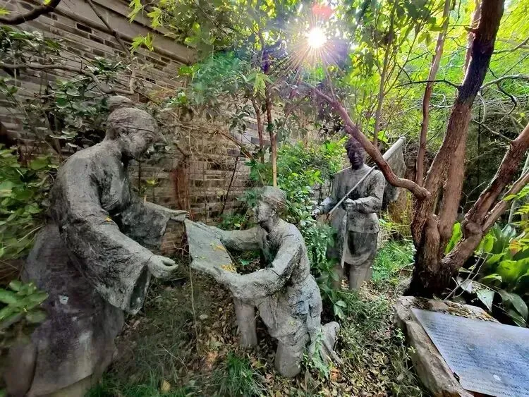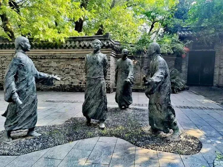 在纪念馆的西边,有一组雕像,似乎是吴敬梓和书童等人,下船向岸上走。在纪念馆正屋的东边,有一组雕塑,在大树下谈论着文学。