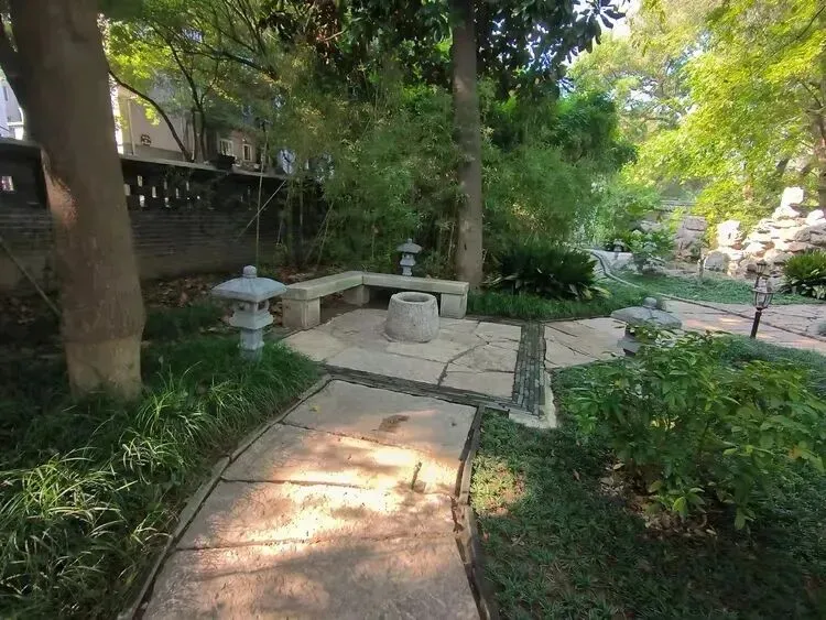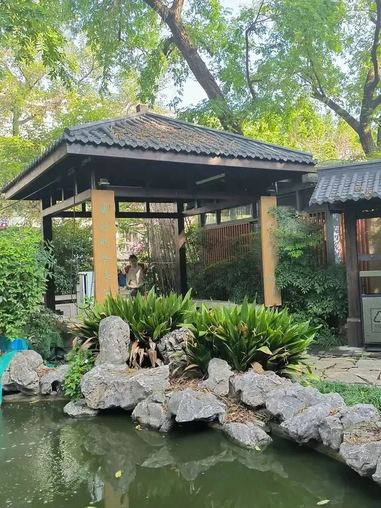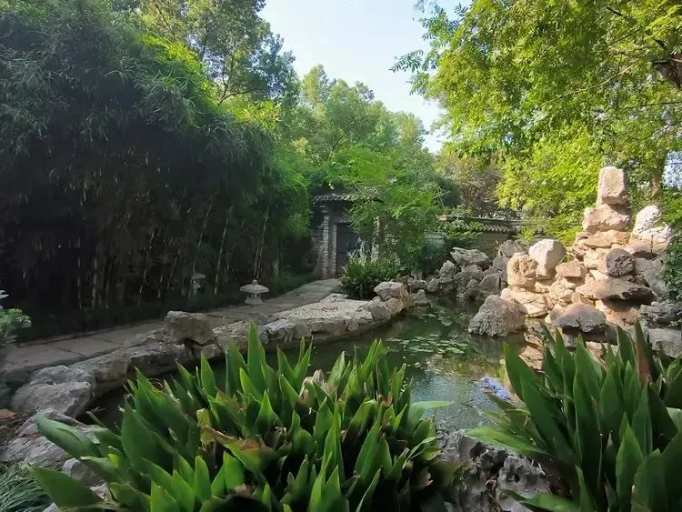 西院(假山莲池+篱笆翠竹):江南庭院水景,拍亭与假山倒影。