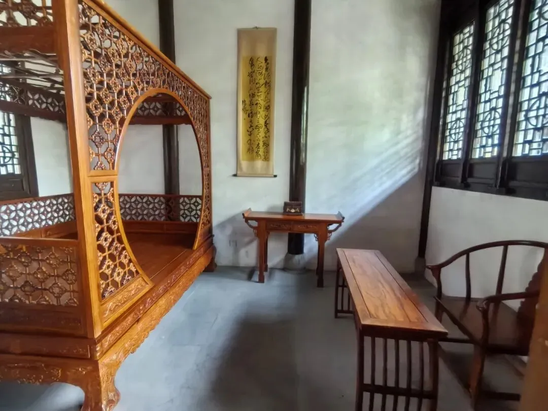 西房:复原卧室(架子床、书桌、文房用具)。房间里的架子床、桌椅等清代风格家具,是为了重现吴敬梓当年的居住状态,尤其是他晚年在秦淮水亭生活时的场景。