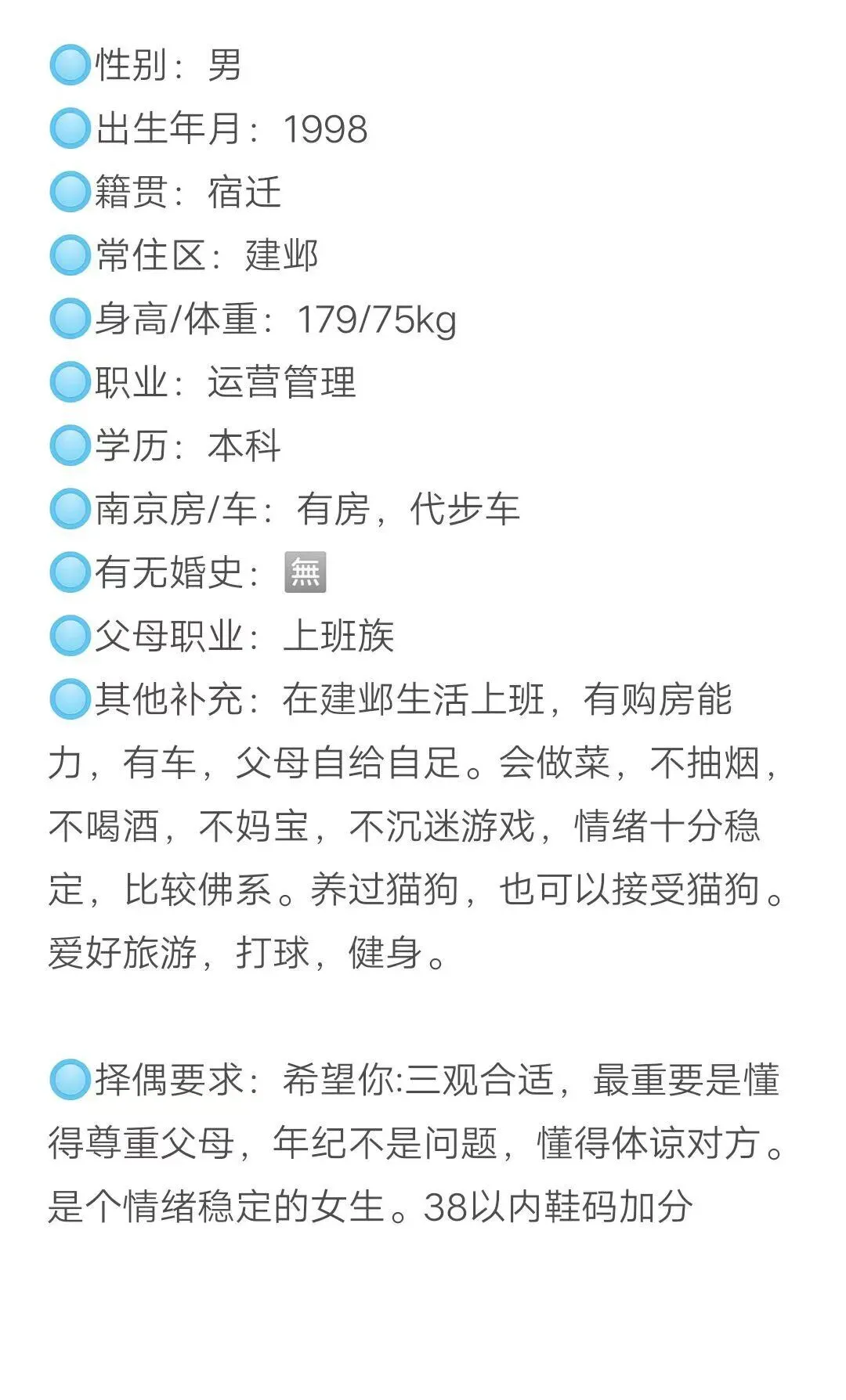 ③、【南京月老爷爷牵线(4811)】男,96年,身高177,目前单身,工程师,宝应人定居南京,想找个三观正的女友。