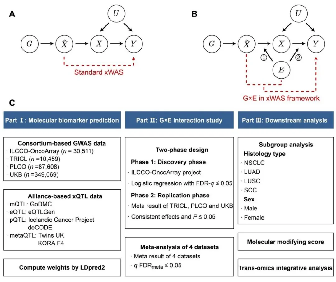 分析组学间标志物关联,挖掘分子机制; 搭建免费在线平台 LungCancer-xWAS-GxE 共享数据。