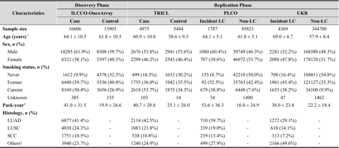✅核心特征:肺癌病例吸烟包年数、现吸烟者占比均显著高于非病例,从不吸烟者占比更低;四项研究的肺癌组织学亚型分布一致。