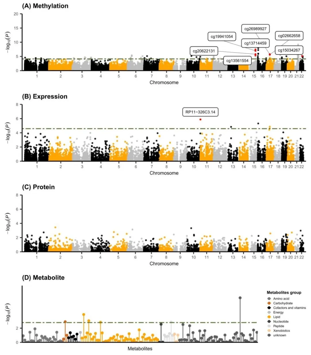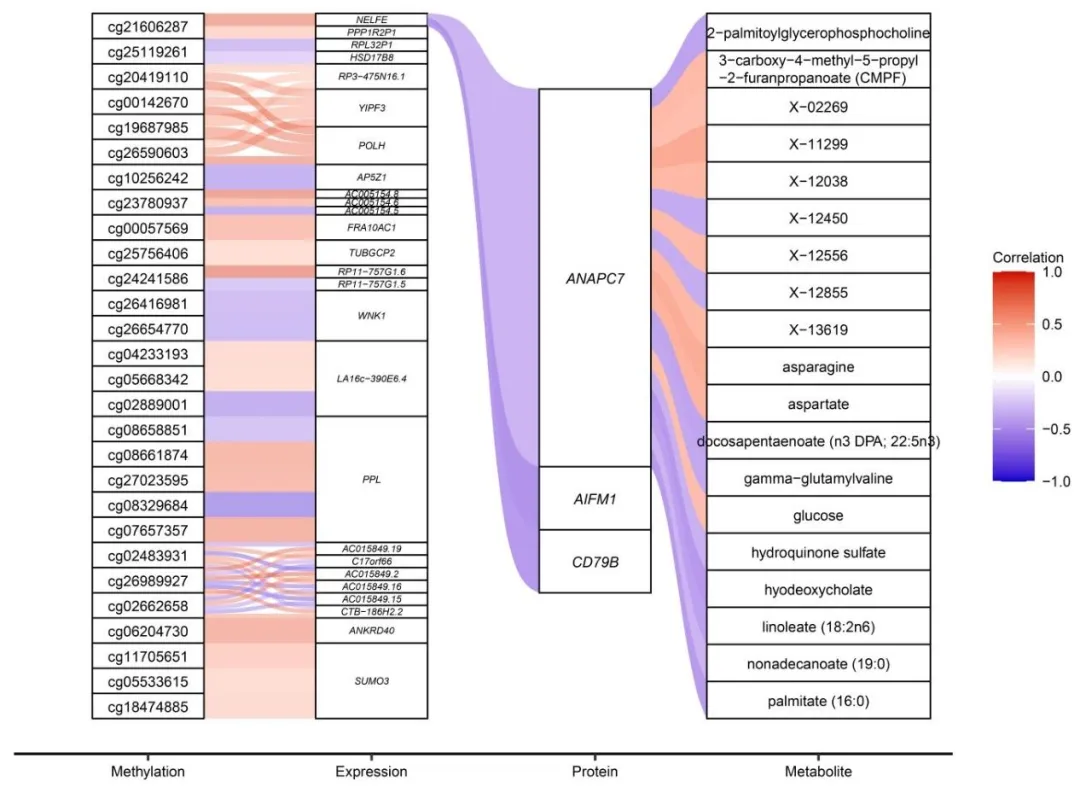 ✅研究共发现 55 个甲基化位点与 26 个基因表达相关,⚡均为顺式调控。仅 NELFE 基因存在反式作用,可调控 3 个蛋白,其中 ANAPC7 又与 19 种代谢物相关。