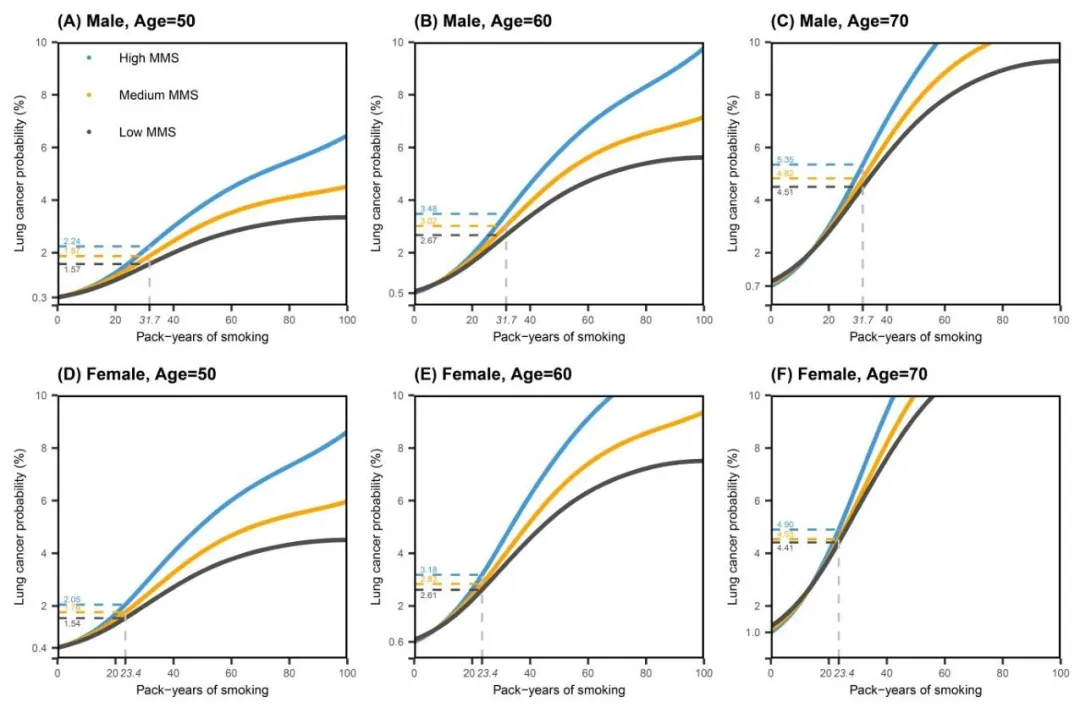 ✅高 MMS 组肺癌风险更高,且吸烟量越大,风险差异越明显。同等条件下,女性肺癌风险略高于男性,但因吸烟暴露更低,整体发病率仍低于男性。