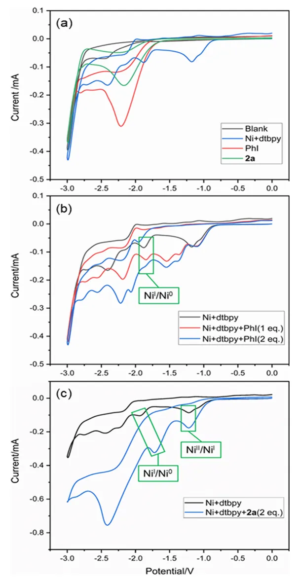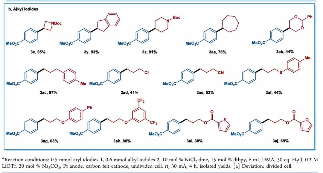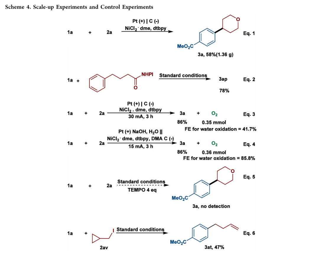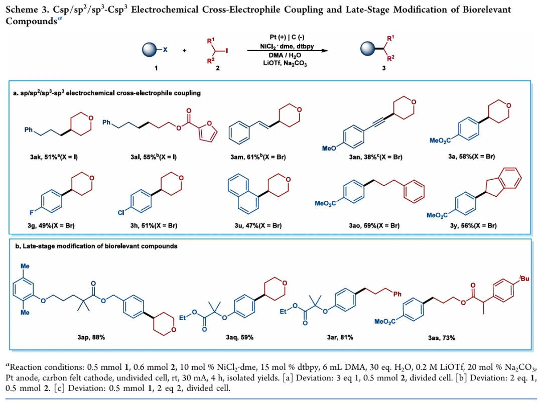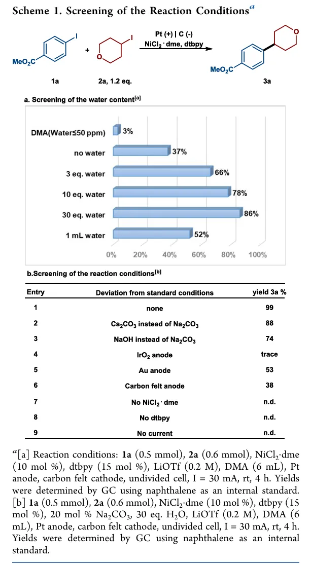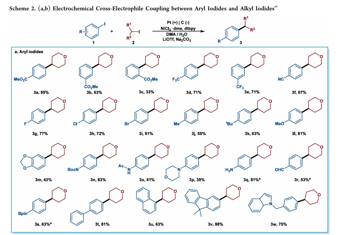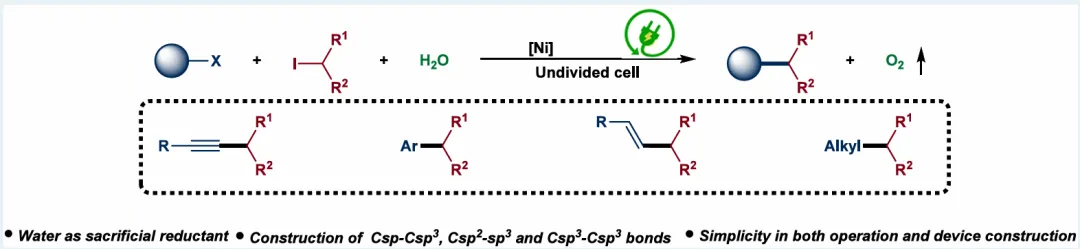 图1. TOC (图片来源于ACS Catal.)Nickel-catalyzed cross-electrophile coupling (XEC) has emerged as an efficient and economical strategy for constructing C−C bonds, a pivotal transformation in diversifying molecular architectures. However, conventional XEC methodologies typically rely on stoichiometric metallic reductants, which present inherent challenges, including safety risks, operational instability, and environmental concerns. Although electrochemical XEC in undivided cells circumvents the need for chemical reductants, it remains constrained by environmental issues and chemoselectivity limitations due to its dependence on sacrificial metal anodes or stoichiometric organic donors to supply electrons for cathodic reduction. Herein, we report a nickel-catalyzed electrochemical cross-electrophile coupling paired with water oxidation. By utilizing water as a sacrificial electron donor, this electrochemical platform facilitates the versatile construction of diverse C−C bonds, including Csp2−Csp3, Csp3−Csp3, and Csp−Csp3 linkages, from readily accessible aryl, alkenyl, alkynyl, and alkyl halide electrophiles, affording products in yields up to 99%. The undivided cell configuration markedly reduces system complexity, lowers capital costs, and supports scalable electrochemical synthesis. Moreover, this electroreductive coupling strategy exhibits broad functional group tolerance and is amenable to the late-stage derivatization of complex drugs and natural products. This operationally simple, electricity-driven approach offers a versatile platform for C−C bond formation.图2. 研究背景及本策略 (图片来源于ACS Catal.)图3. 条件优化 (图片来源于ACS Catal.)图4. 循环伏安实验 (图片来源于ACS Catal.)图5. 芳基碘和烷基碘的电化学交叉亲电偶联反应底物拓展 (图片来源于ACS Catal.)图6. 电化学交叉亲电偶联反应构建Csp/sp2/sp3-Csp3键底物拓展及生物相关活性分子的后期修饰反应 (图片来源于ACS Catal.)图7. 放大反应、控制实验 (图片来源于ACS Catal.)