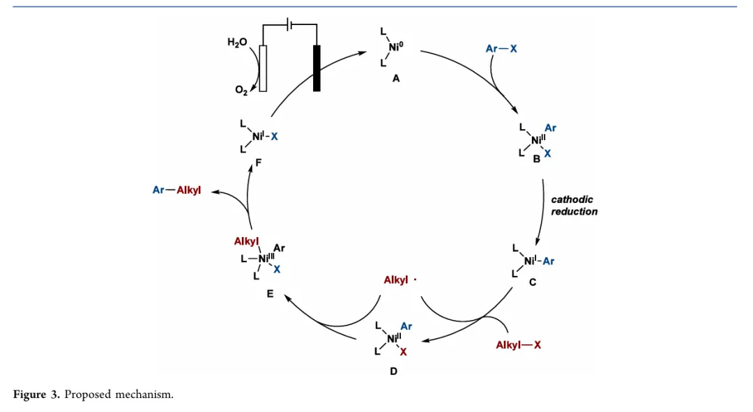 图8. 可能的反应机理 (图片来源于ACS Catal.)In summary, we have developed a novel nickel-catalyzed electroreductive cross-coupling method for C−C bond formation using H2O as an economical and sustainable sacrificial reductant. This electrochemical platform enables the versatile constructionof diverse C−C bonds, including Csp2−Csp3, Csp3−Csp3, and Csp−Csp3 linkages, from readily accessible aryl, alkenyl, alkynyl, and alkyl halide electrophiles, delivering products in yields of up to 99%. The approach eliminates the need for sacrificial metal anodes or stoichiometric organic reductants, offering a more sustainable and operationally straightforward alternative for cross-electrophile coupling. Furthermore, this electroreductive coupling strategy displays excellent functional group tolerance and is suitable for the late-stage derivatization of complex drugs and natural products. This operationally simple, electricity-driven method provides a sustainable and versatile platform for C−C bond formation. We anticipate that this strategy will find broad utility in synthetic and medicinal chemistry.
