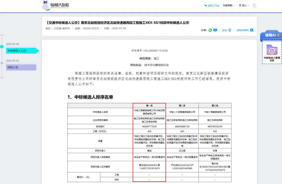 >【江苏-南京】4.62亿!中铁四局、中铁三局中标:南京北站快速路西段工程总包项目!