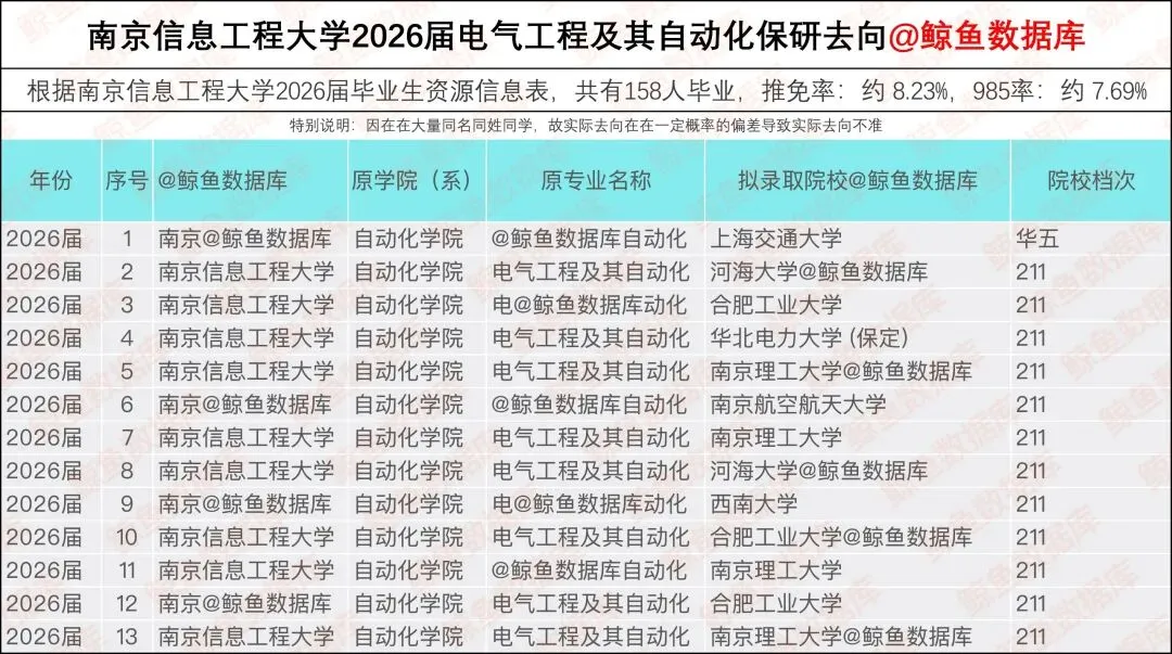 以下数据由鲸鱼数据库整理而来,毕业生人数依据南京信息工程大学《2026届毕业生生源信息表》制作。从数据可见,南京信息工程大学电气工程及其自动化专业毕业生有185人,2026届电气工程及其自动化专业获得保研的人数有13人,保研率8.23%
