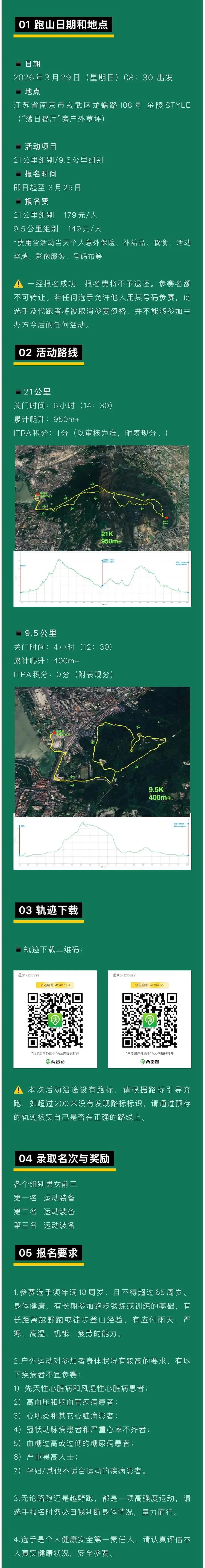 跑进春光!2026山径探索三月跑山训练赛定于3月29日(周日)8:30在江苏省南京市玄武区龙蟠路108号金陵STYLE(“落日餐厅”旁户外草坪)开跑,设21公里、9.5公里两个项目;即日起-3月25日开放报名,额满即止!
