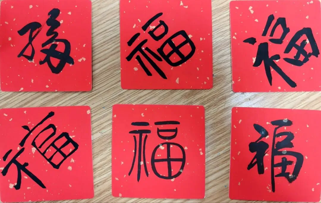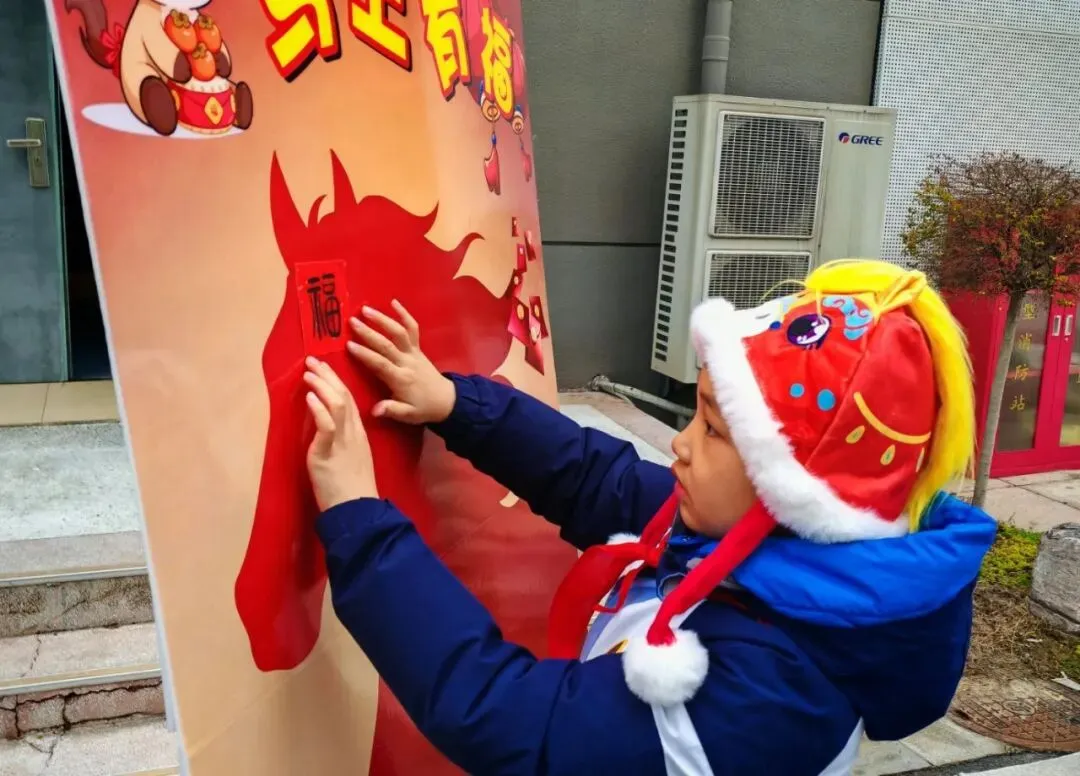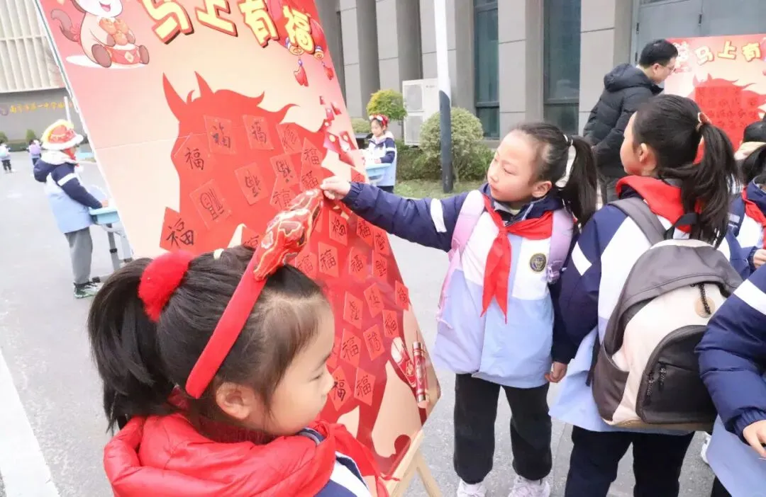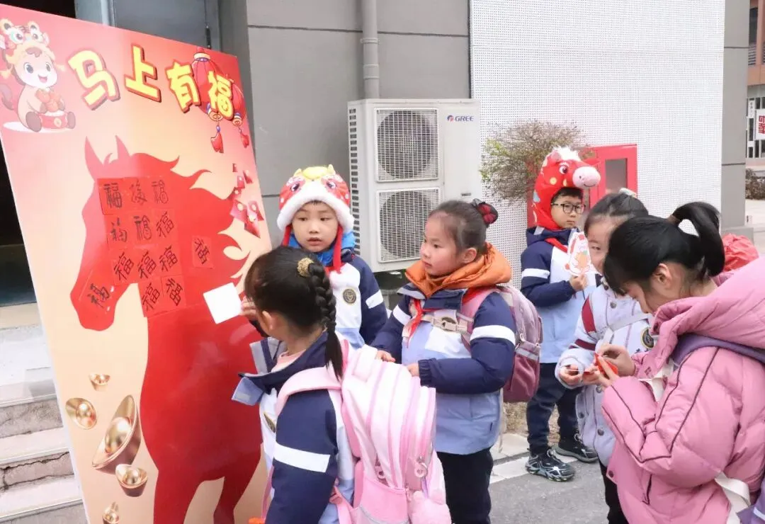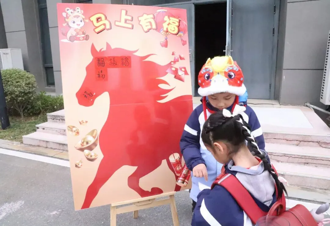 在“马上有福”入门礼环节,一张张写着“福”字的宣卡纸,承载着学校对学子的美好期许。孩子们亲手将福字贴在主题展板上,红色的福字汇聚成一片温暖的海洋,寄托着马年吉祥如意、幸福安康的祝愿。