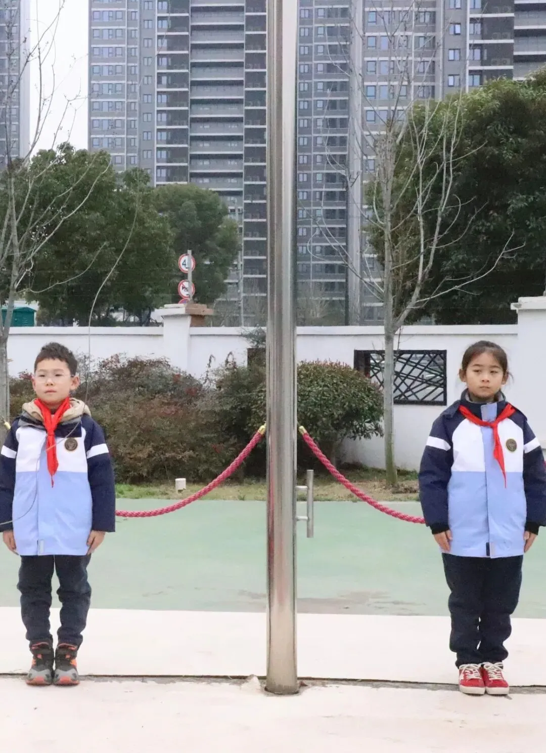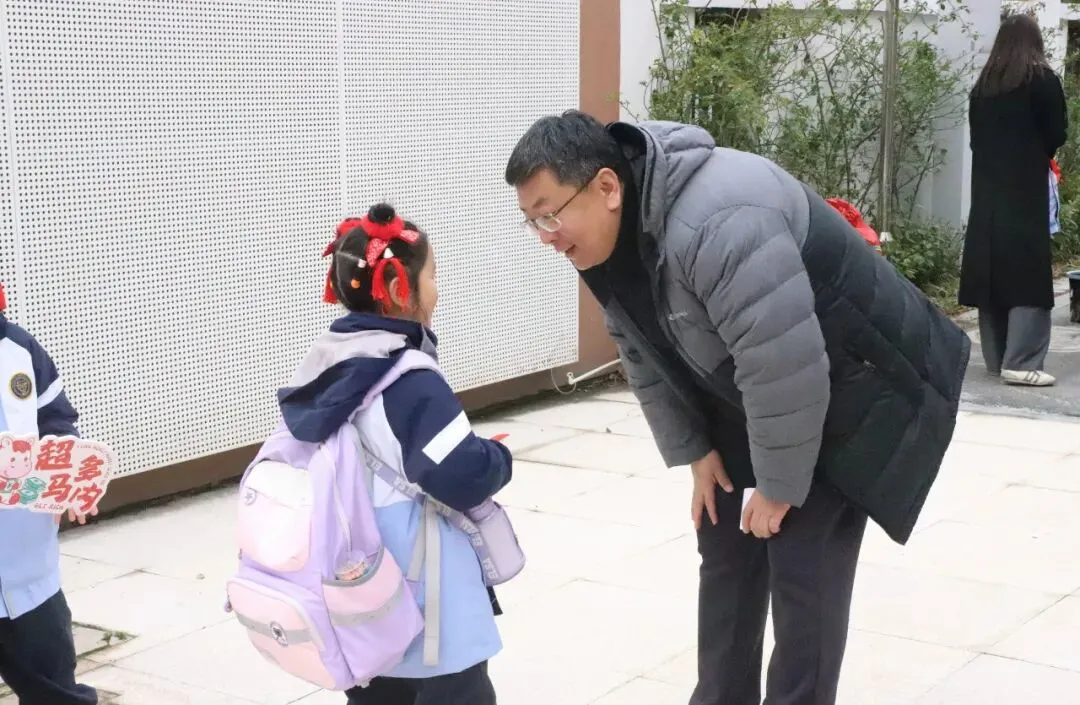 学校领导们早早的等待在校门口,他们面带微笑,迎接着求真娃们的到来,为孩子们送上新学期的温暖祝福。
