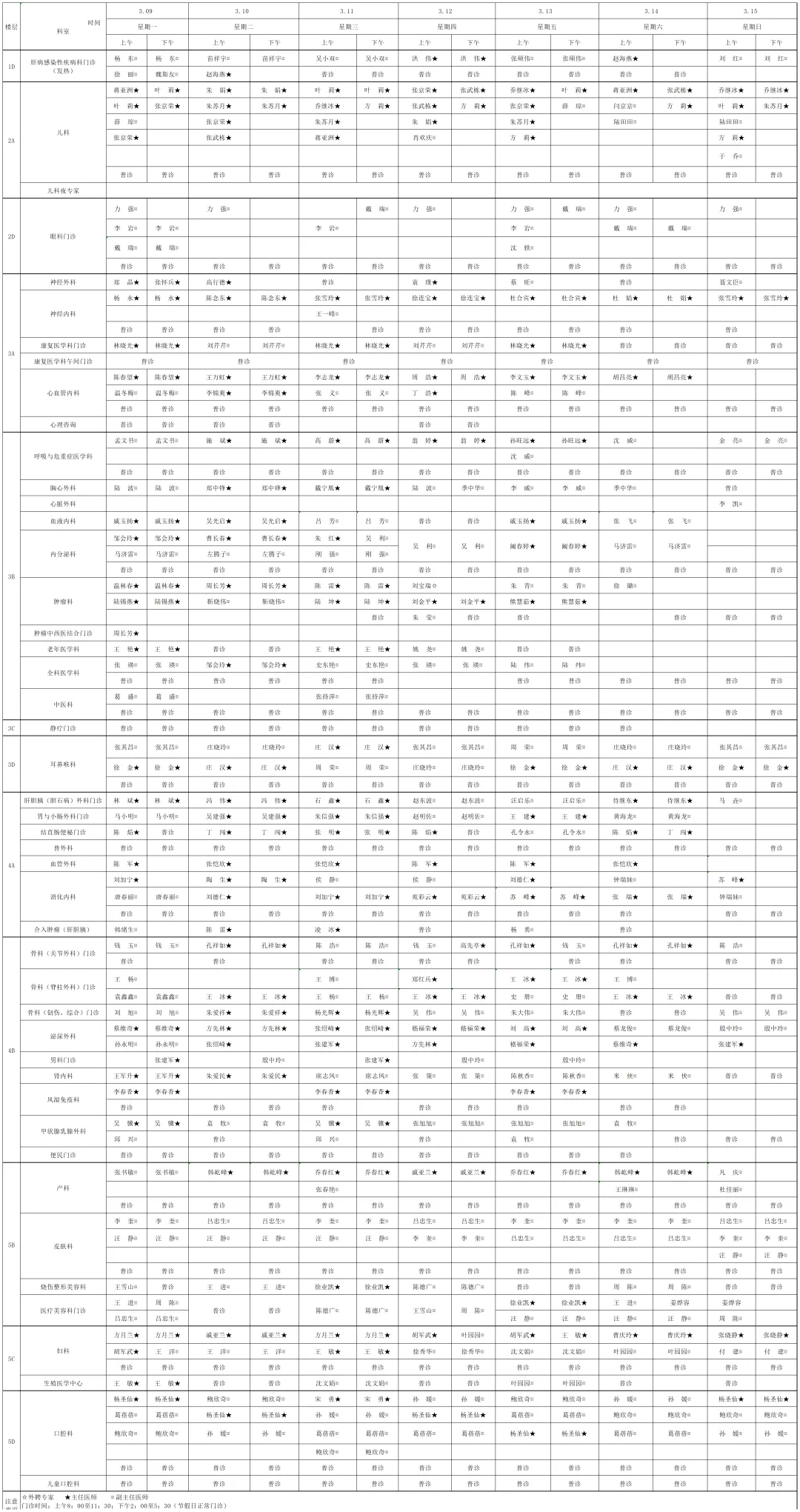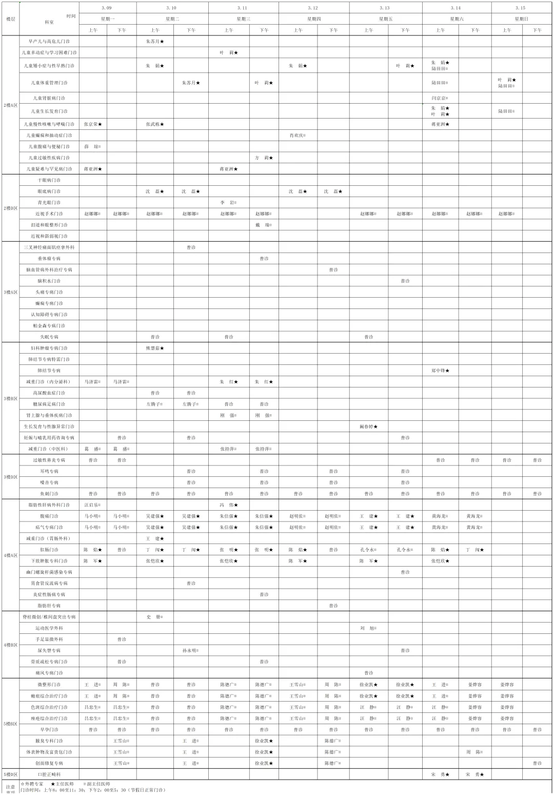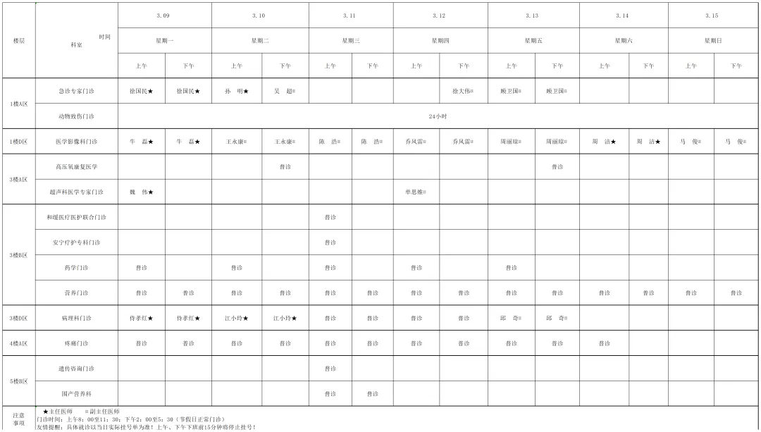 为提高广大市民朋友们的就医体验,宿迁医院门诊部现将(03月9日-03月15日)门诊排班表向您公示。便于您根据自身情况,选择合适的医生、合适的时间就诊。