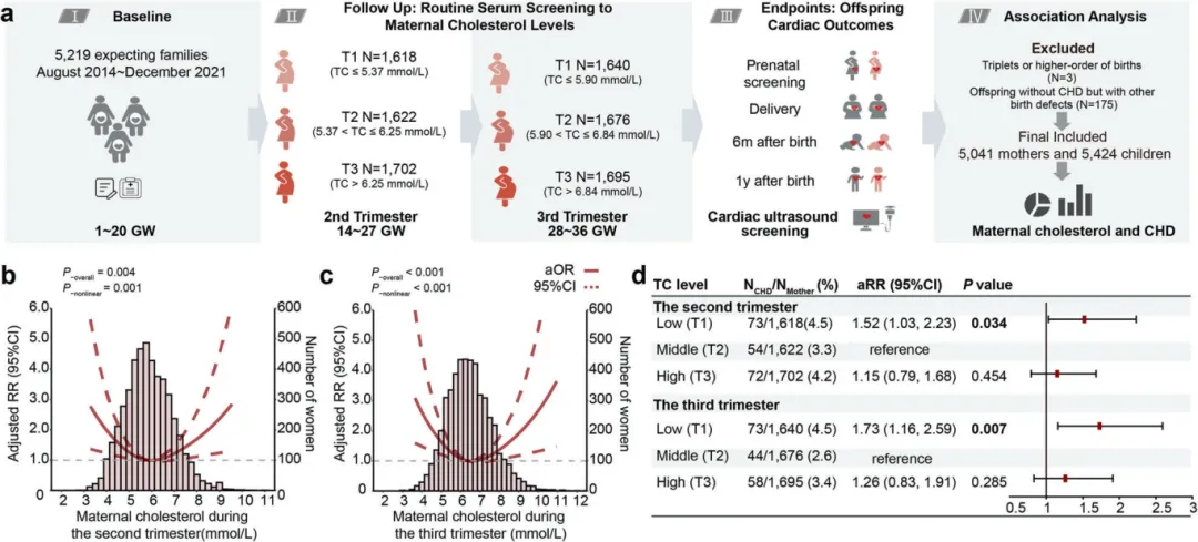 研究首先在一个包含5041个家庭的前瞻性出生队列中发现,母体血清胆固醇水平与子代CHD风险呈U型关联。在妊娠中、晚期,胆固醇水平最低(T1组)的母亲,其子代患CHD的风险显著升高(RR分别为1.52和1.73)【图1b-d】。这表明胆固醇过低或过高都可能增加风险,但低胆固醇的影响更为明确。