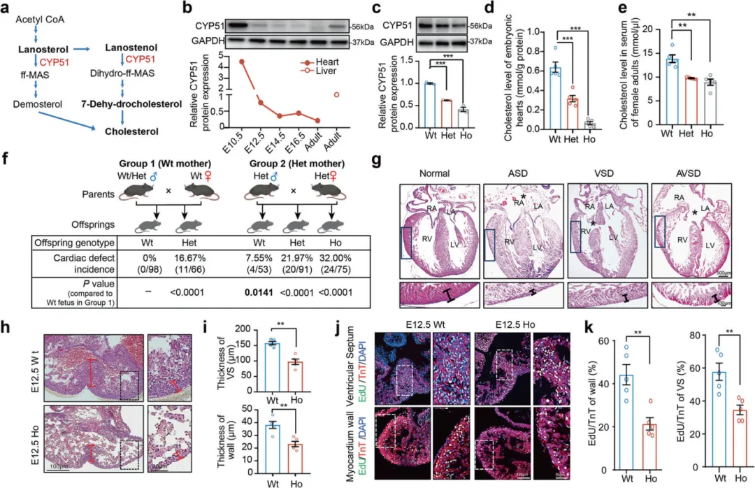 突变小鼠胚胎心脏的胆固醇水平急剧下降,并且约32%的纯合突变新生儿出现心脏结构缺陷,如房间隔缺损、室间隔缺损和心肌变薄,证实该突变通过干扰胆固醇合成导致CHD【图3c-i】。