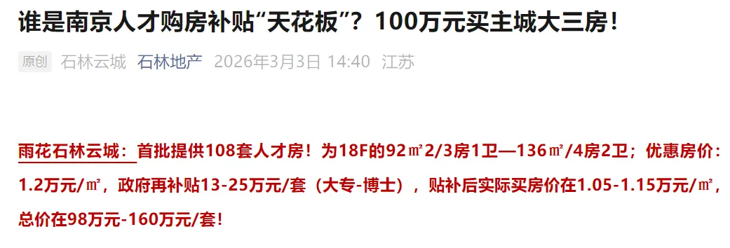 100万在南京买房,正在狠狠奖励每一个愿意留下的年轻人。