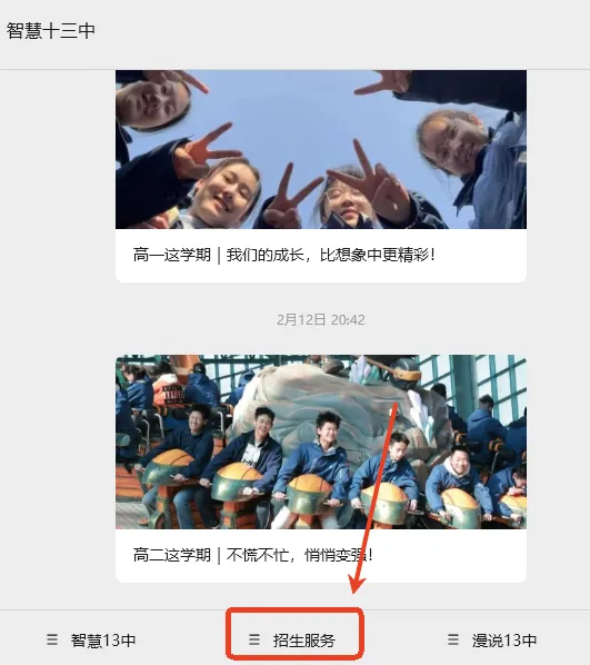 十三中的特长生信息登记渠道也开启了,大家可以在【智慧十三中】公众号平台的【招生服务】栏进入,填写信息。