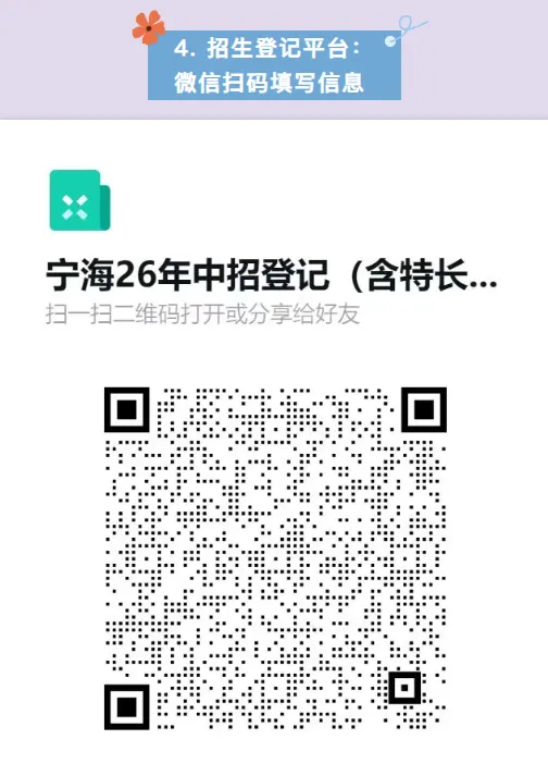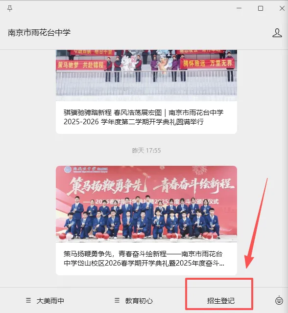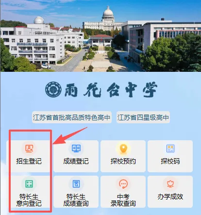 雨花台中学的登记入口为【南京市雨花台中学】公众号信息界面右下角【招生登记】栏。想报考特长生的孩子和家长需要先填写【招生登记】,再进行【特长生意向登记】。