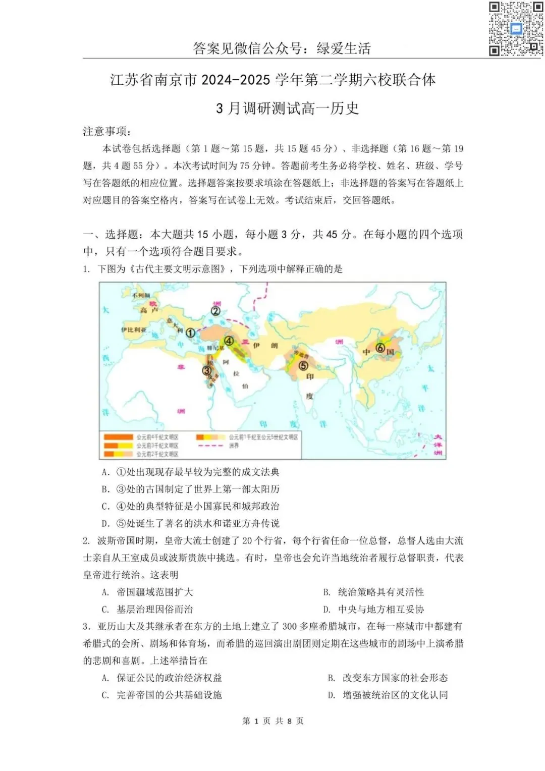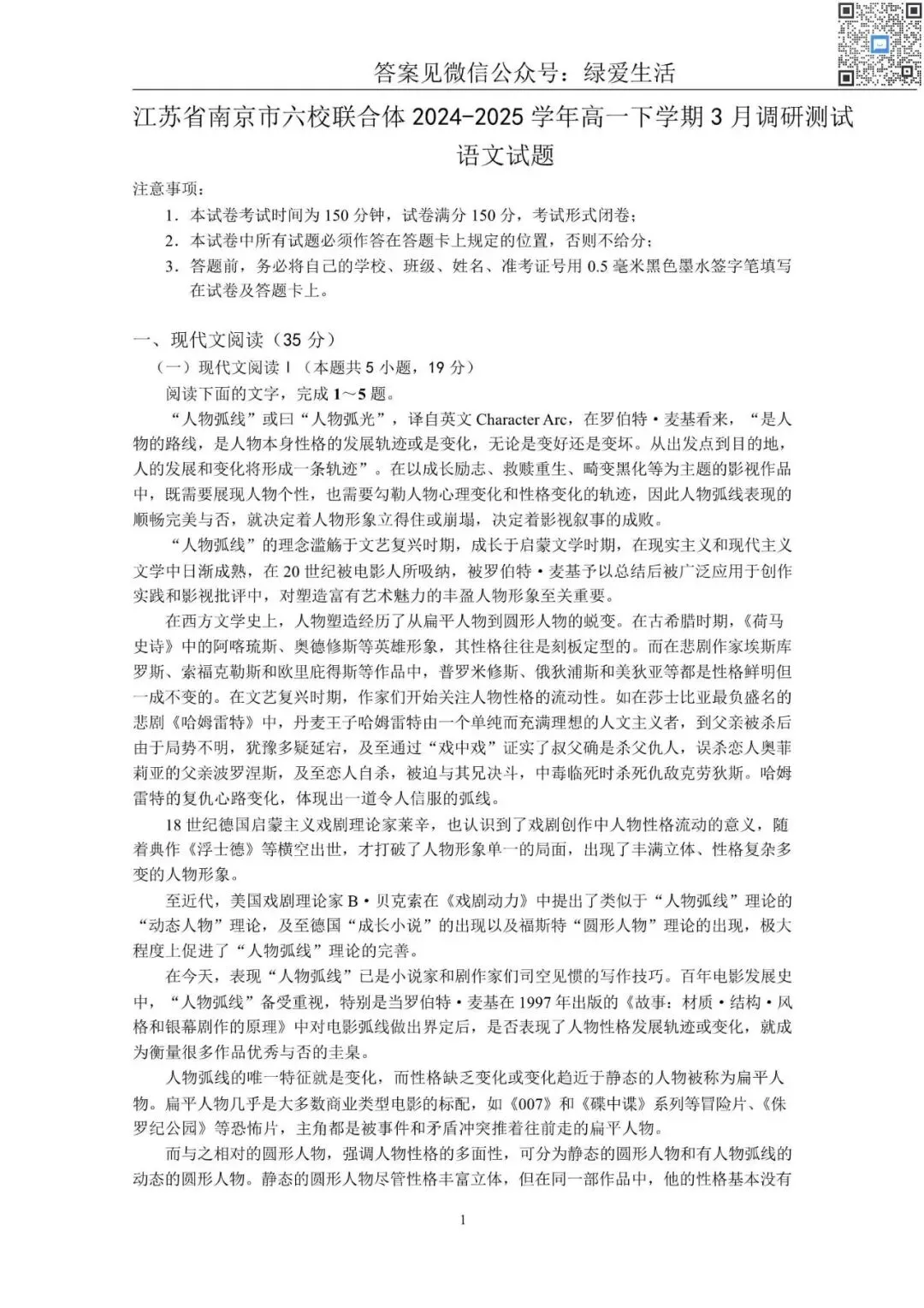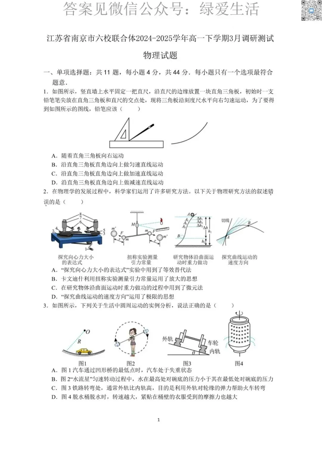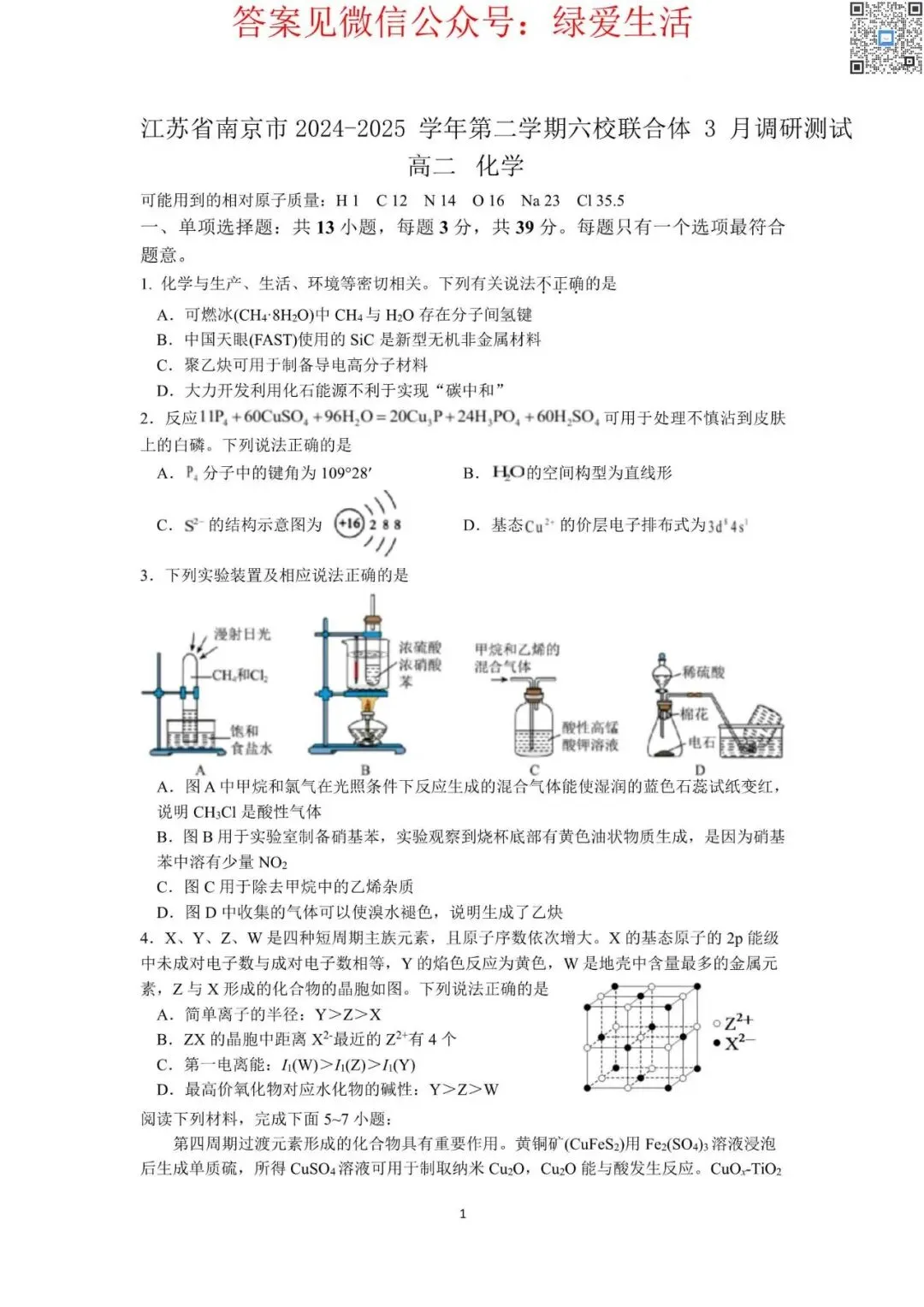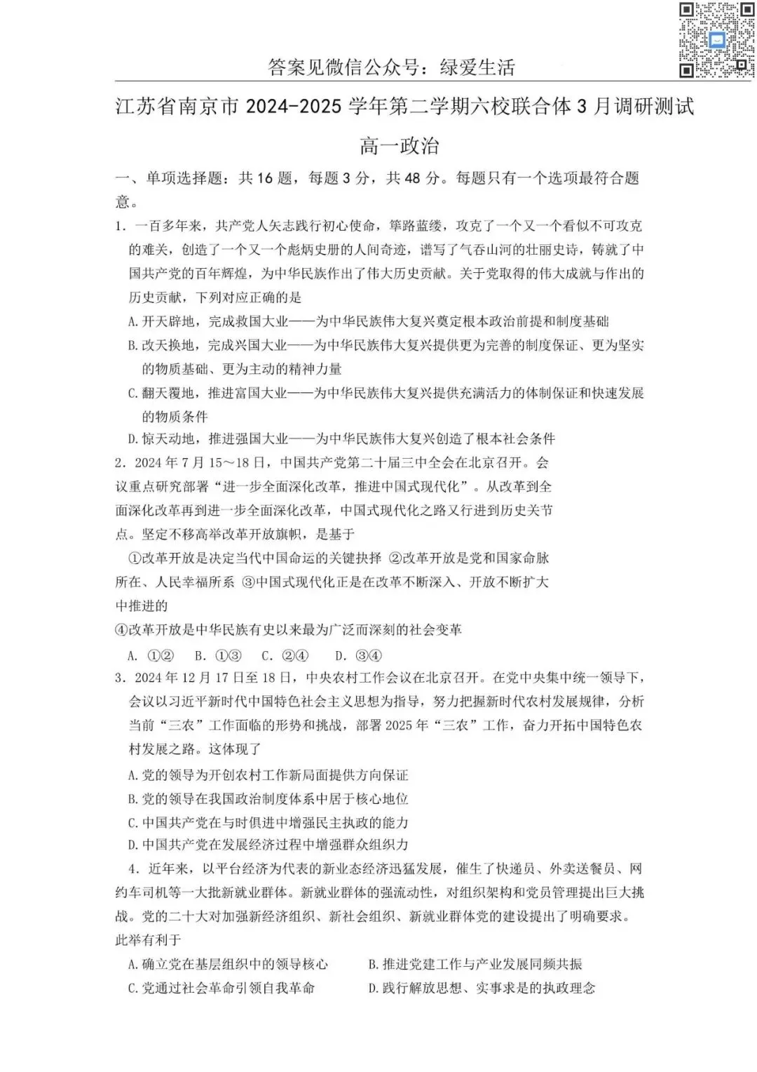 南京六校联合体2024-2025学年高一下学期3月调研测试试卷优点介绍
