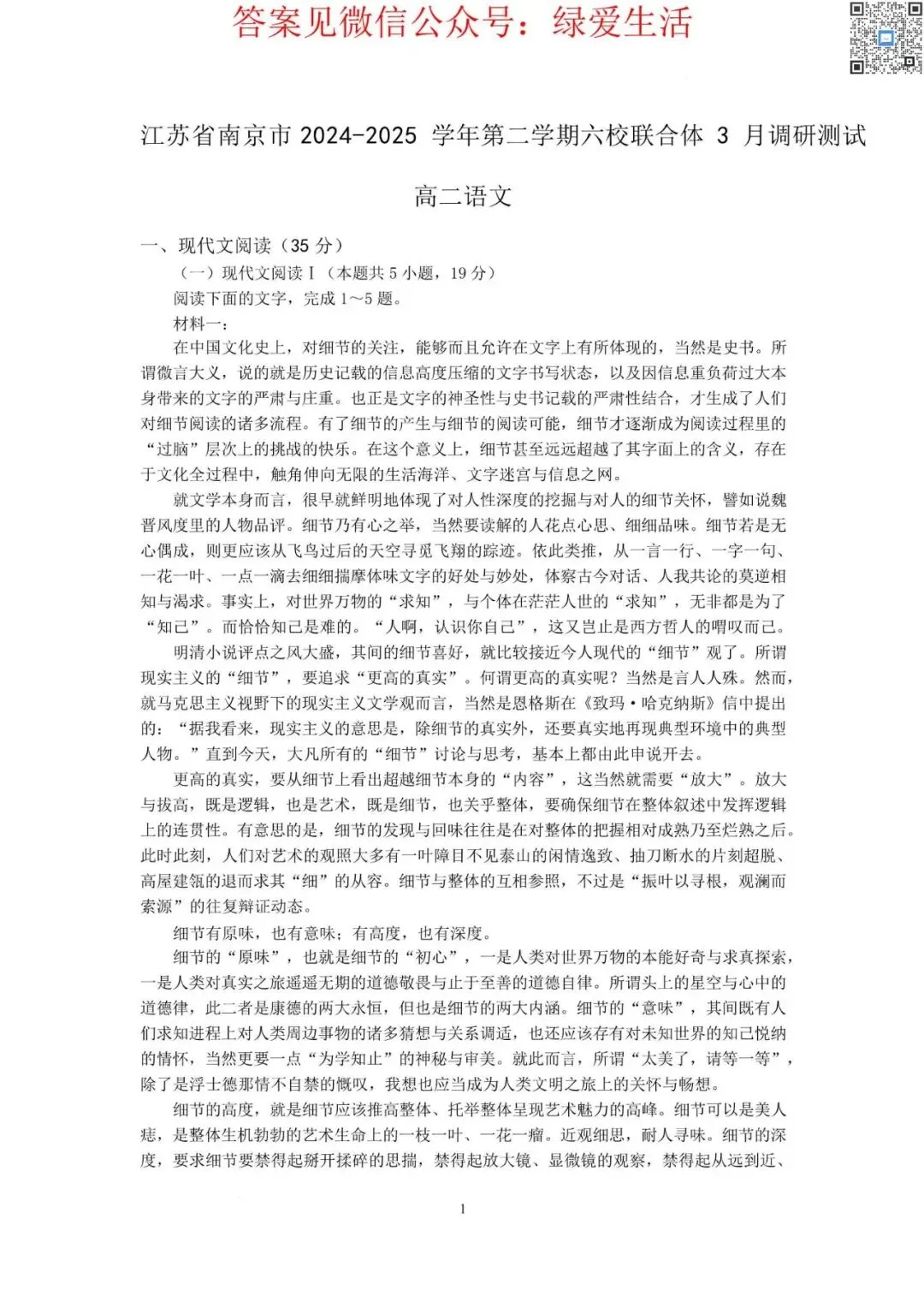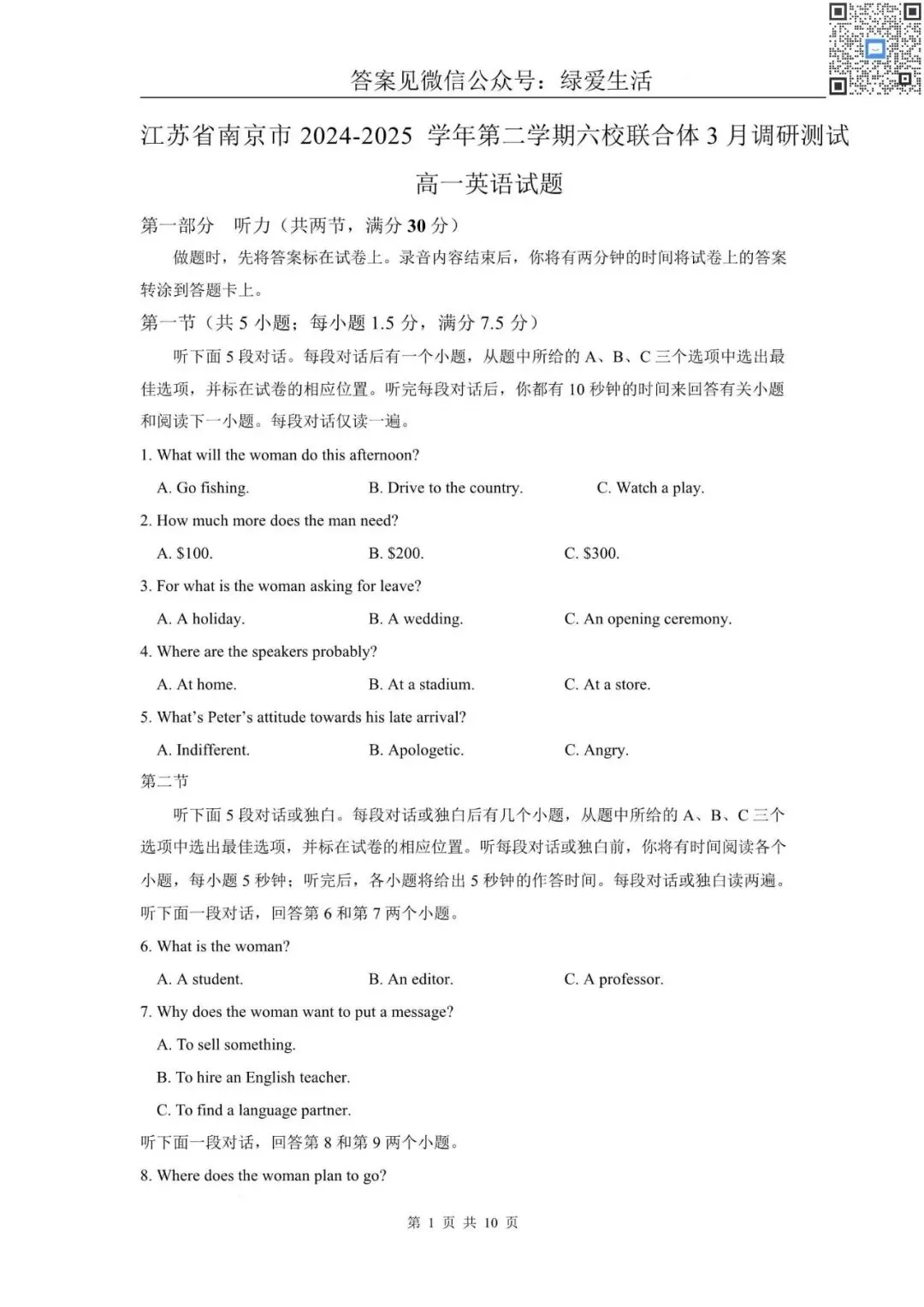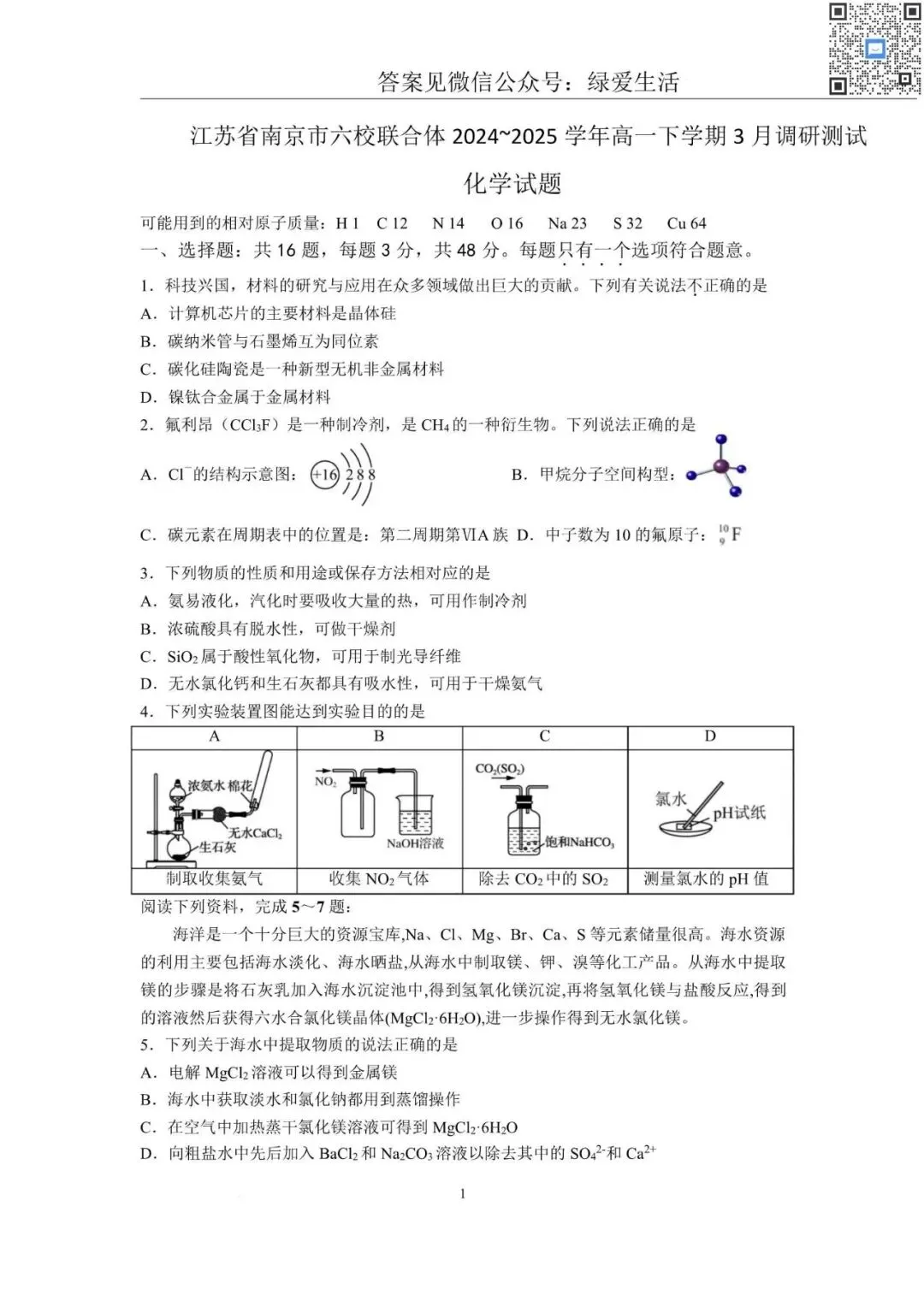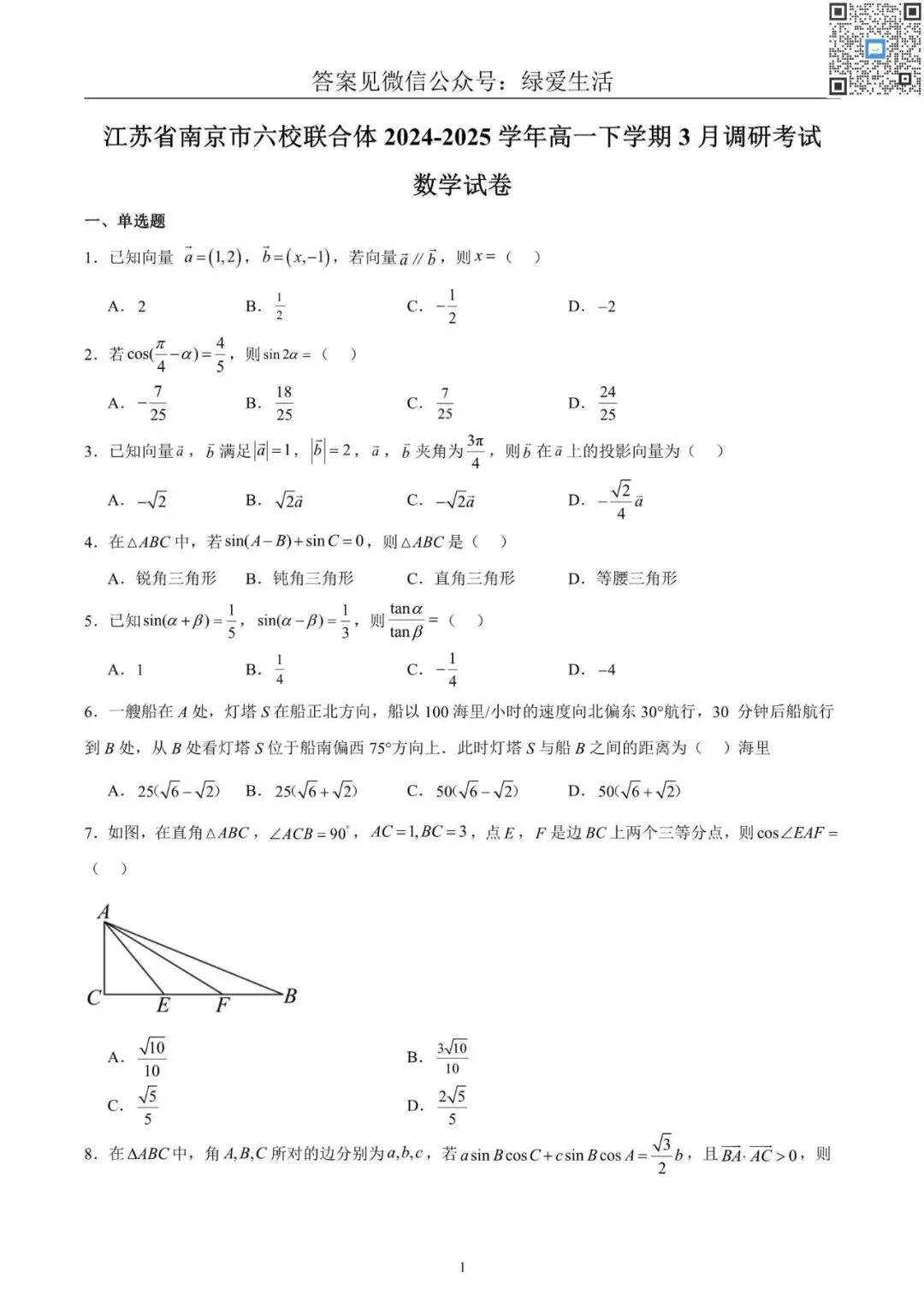 南京六校联合体2024-2025学年高一下学期3月调研测试试卷优点介绍