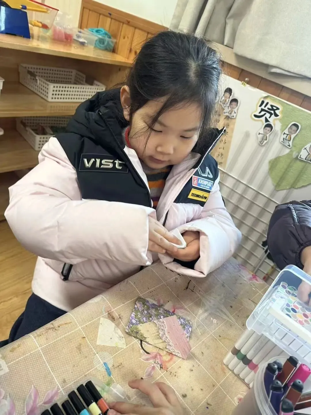 活动中,孩子们在老师的带领下,亲手制作了充满心意的手工手提包礼物。他们认真地涂色、粘贴、装饰,将对长辈们的感恩与祝福,都藏进了这一个个小小的、色彩斑斓的手提包里。