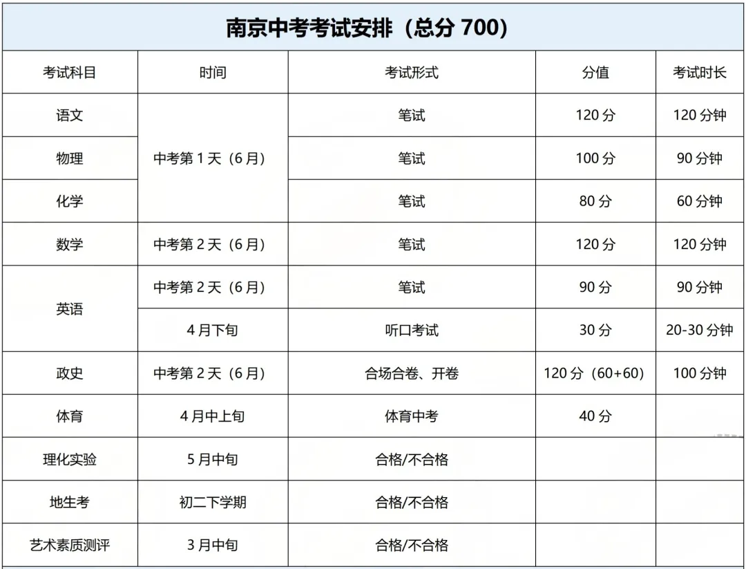 南京中考总分是700分,笔试科目有语文、物理、化学、数学、英语、史政,其中英语听力在4月中旬考察,满分30分,计入中考分数。体育考试在4月初进行,满分40分,计入中考分数。各科考试时间及分值如下: