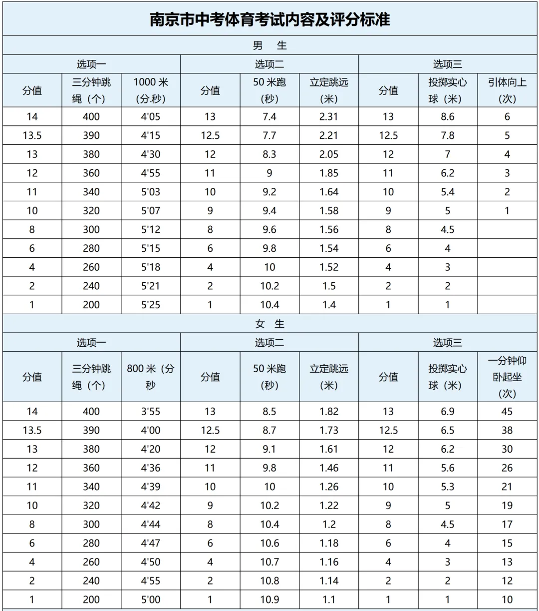 南京体育中考有三个选项,以下为体育中考成绩对照表: