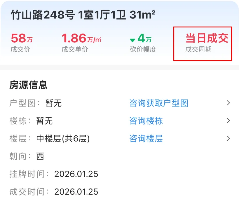 1月25日,江宁区竹山路248号成交一套建面约31.24㎡房源,成交总价58万,成交单价18566元/㎡,挂出当天就成交了!