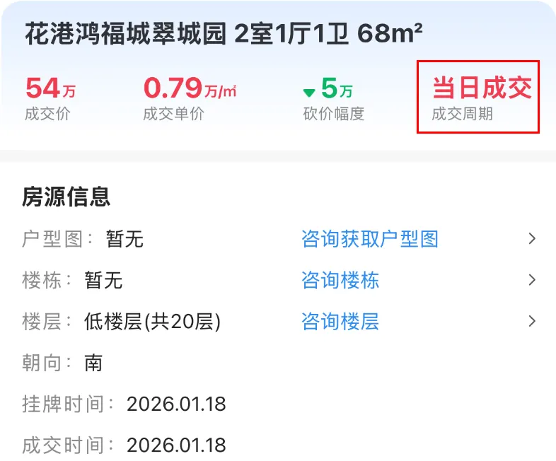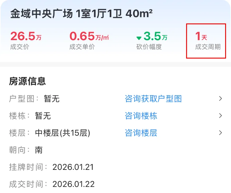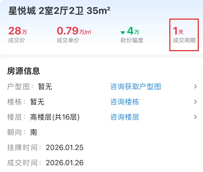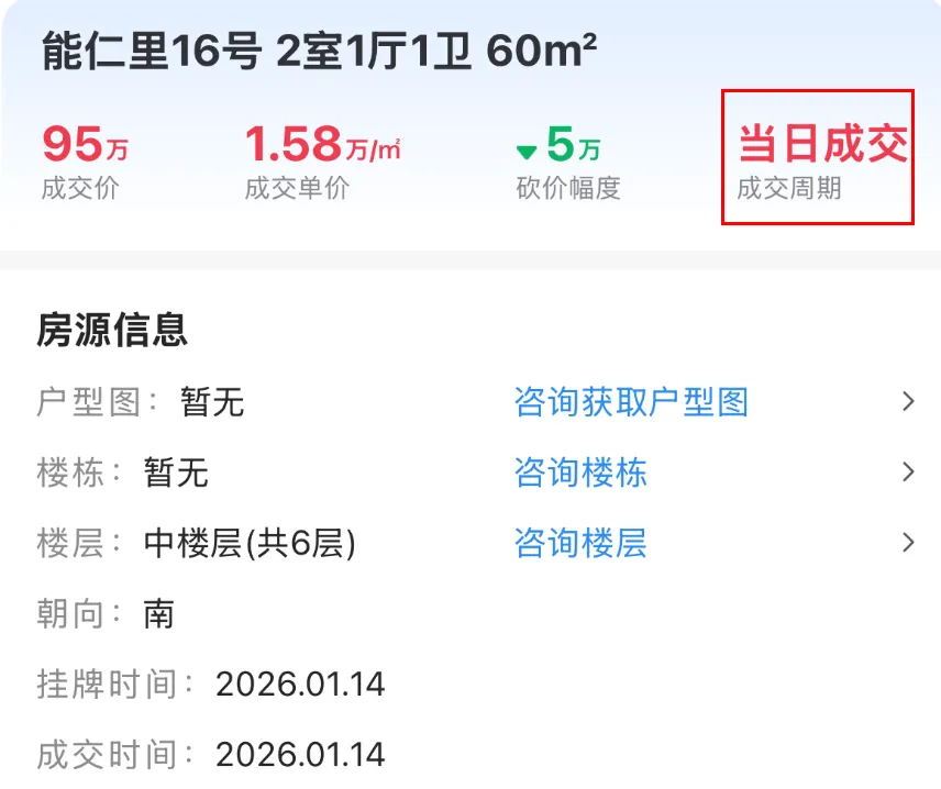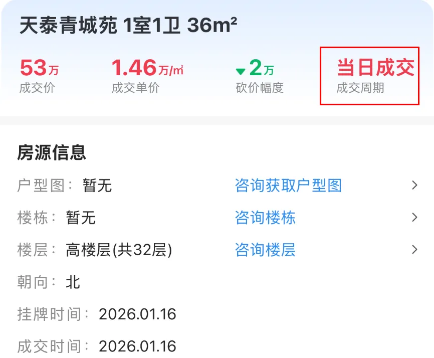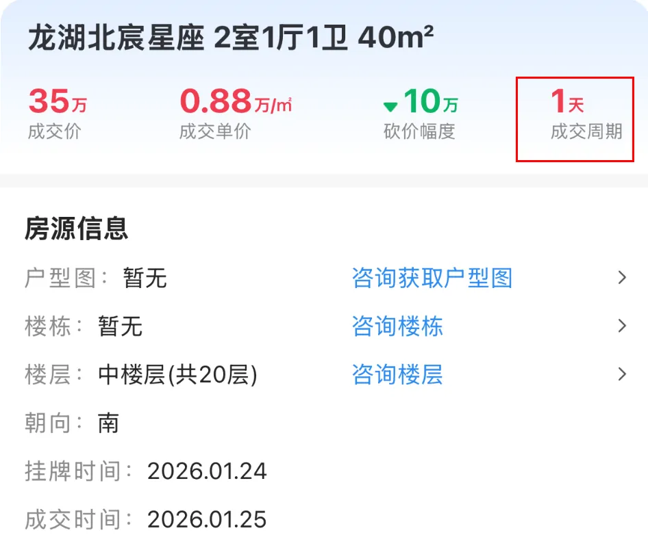 1月14日,雨花台区能仁里16号成交一套建面约60.02㎡房源,成交总价95万,成交单价15829元/㎡,挂出当天成交。1月16日,江宁区天泰青城苑成交一套建面约36.29㎡房源,成交总价53万,成交单价14605元/㎡,挂出当天成交。1月25日,浦口区龙湖北宸星座成交一套建面约40㎡房源,成交总价35万,成交单价8750元/㎡,成交周期1天。1月18日,栖霞区花港鸿福城翠城园成交一套建面约68.16㎡房源,成交总价54万,成交单价7923元/㎡,挂出当天成交。1月26日,浦口区星悦城成交一套建面约35.36㎡的房源,成交总价28万,成交单价7919元/㎡,成交周期1天。1月22日,鼓楼区金域中央广场成交一套建面约40.93㎡的房源,成交总价26.5万,成交单价64.75元/㎡,成交周期1天。能够看出,这些刚挂出就成交的房源,一是买房人迫切想买,还有就是可能价格、房源都比较合适,普遍都是适合刚需入手的低总价房源。大家觉得呢?注:点击查看更多南京楼市信息