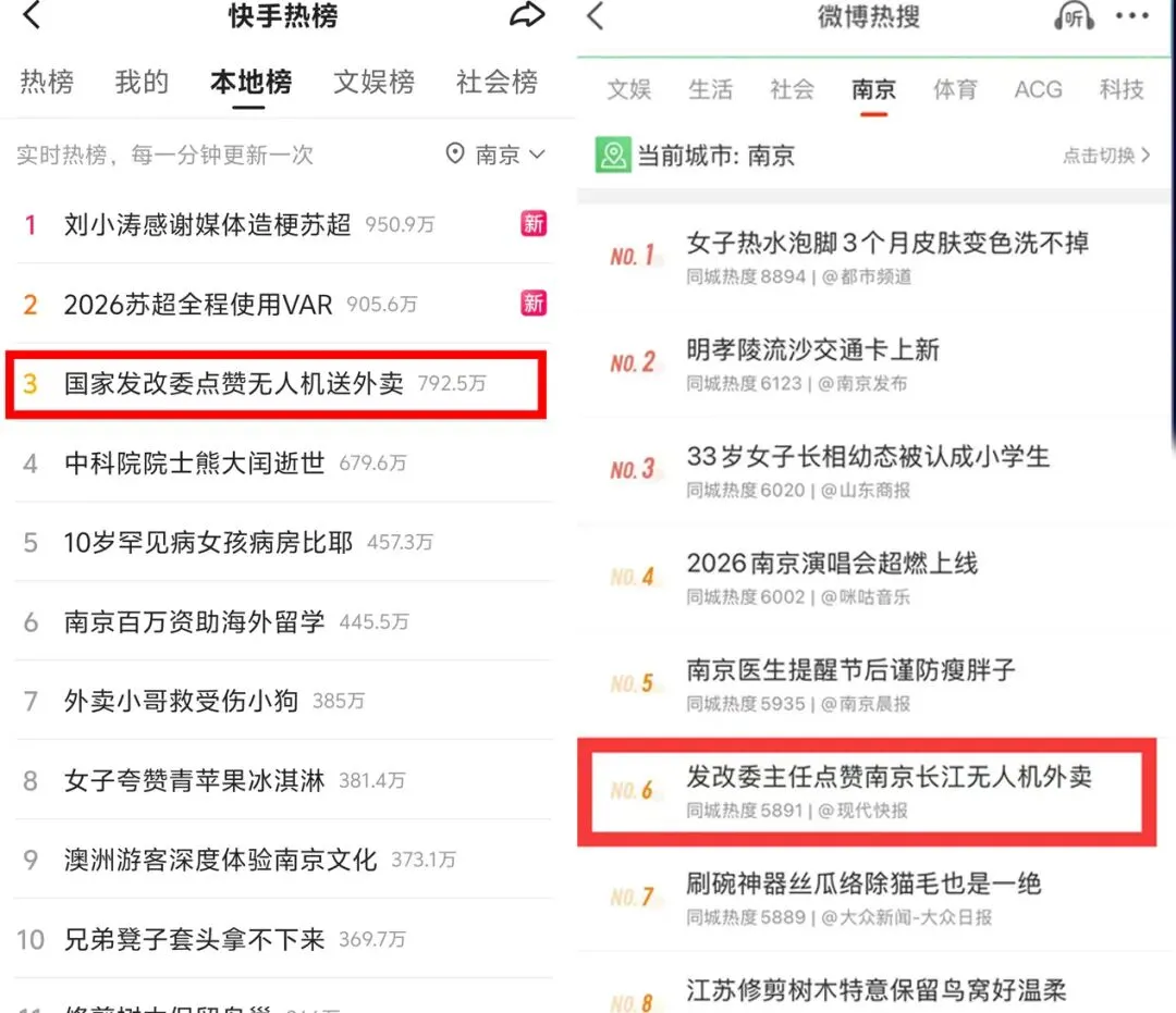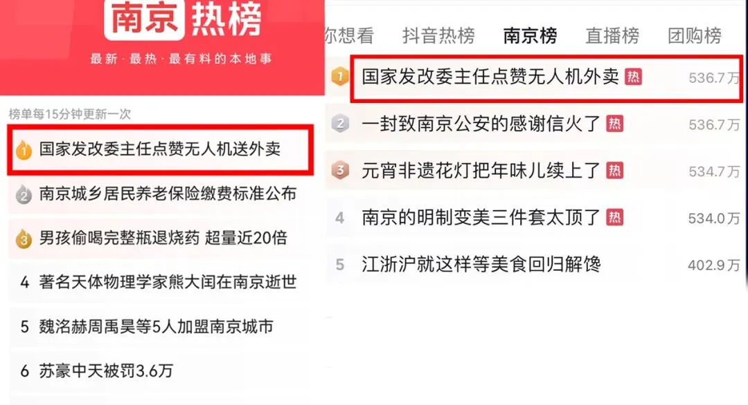 这番点赞瞬间点燃全网热情,“国家发改委主任点赞无人机送外卖”话题火速冲上各大平台热搜榜。