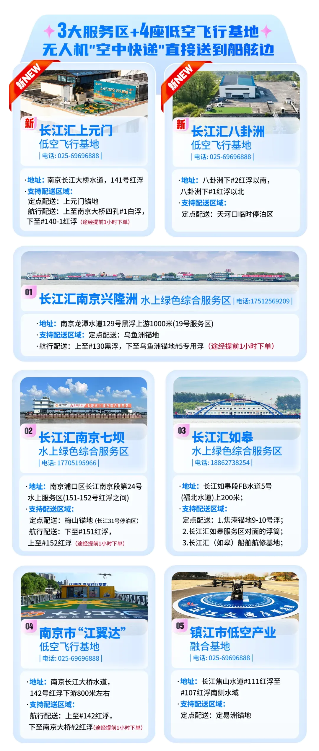 目前,长江汇在南京段的无人机配送网络已全面铺开,上游、中游、下游三段核心水域均设有常态化无人机配送网点!船舶航行全程无需调整航线或靠泊等待,打开"长江汇"微信小程序下单,无人机就能跨江接力,把物资稳稳送到船边。