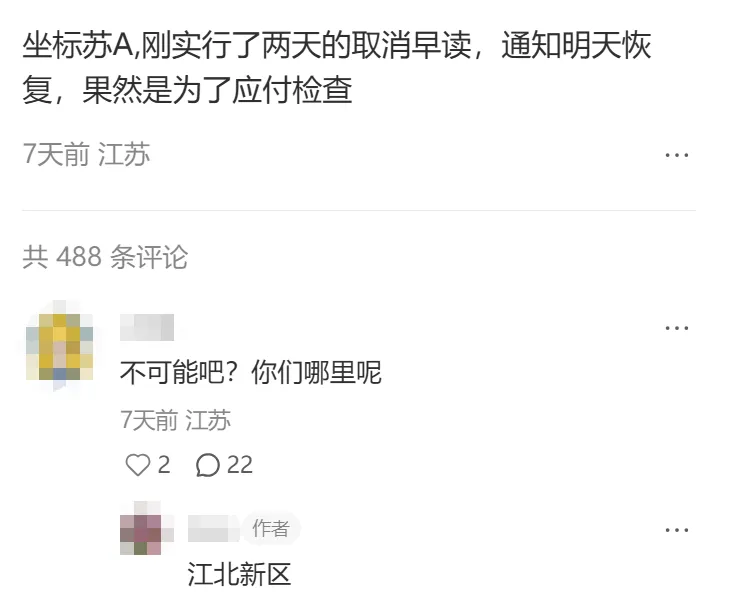 除了南京之外,江苏其他地区也有部分学校通知恢复早读。