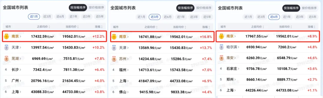 根据某二手房平台展示的数据,近1个月南京二手房涨幅12.2%,近3个月涨幅16.8%,近6个月涨幅8.9%。三个时间维度来看,涨幅都是第一,妥妥的领涨全国。