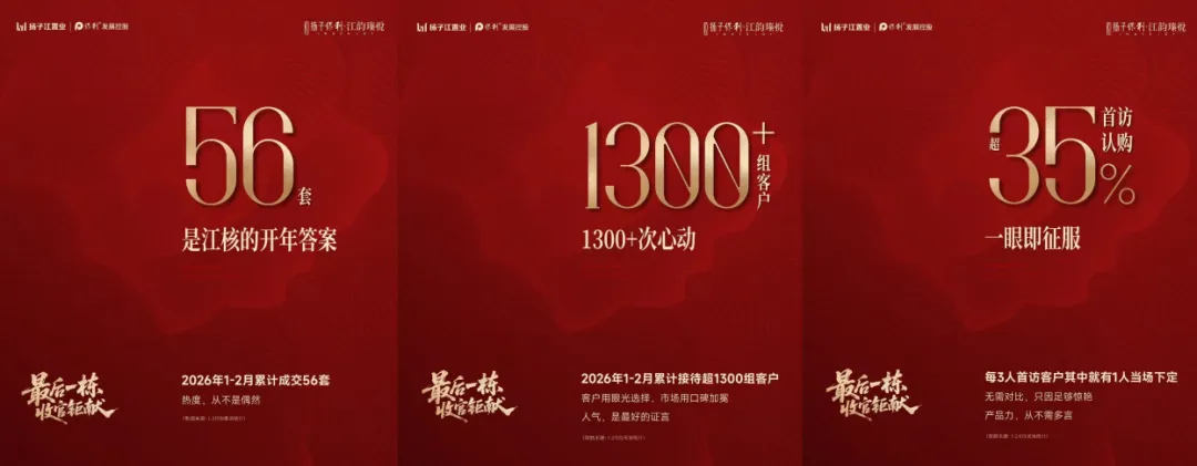 江北核心区的超级红盘——扬子保利·江韵瑧悦,开年同样卖爆了!2026年1-2月累计成交56套,超1300组客户来访,首访认购率超35%,数据背后彰显项目强大的市场号召力。