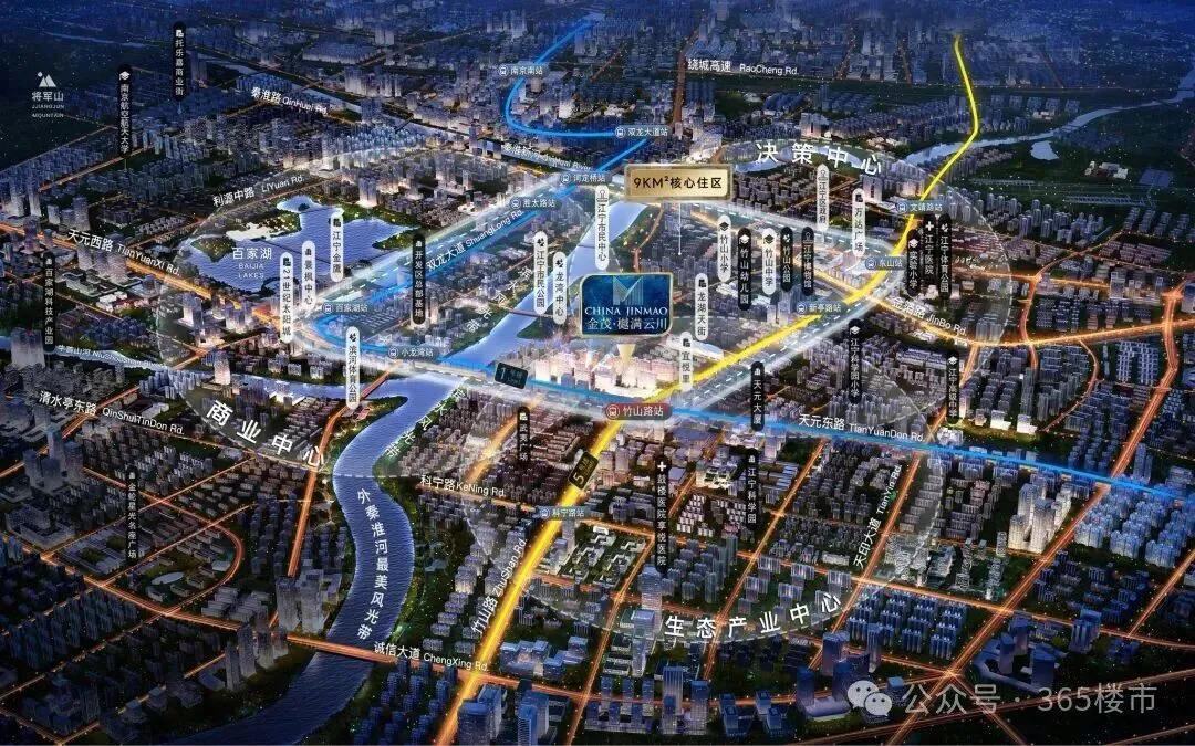 项目占据地铁1号线、5号线双轨交汇竹山路之上,虹吸江宁“三心一带”(东山决策中心、百家湖商业中心、生态产业中心,外秦淮最美风光带)的高能级资源,名副其实的江宁“宇宙中心”。