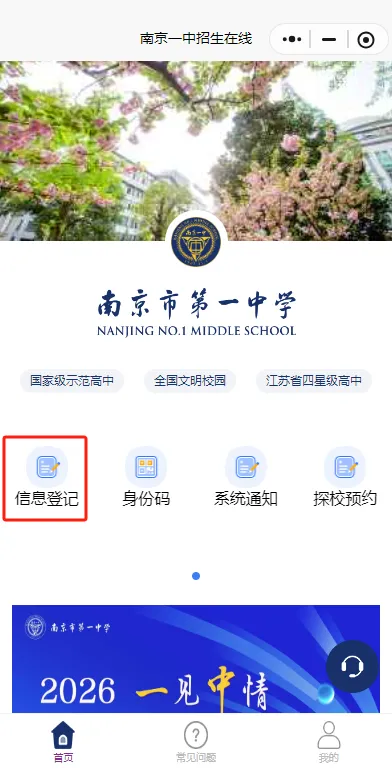 1. 微信打开【南京一中】公众号 2. 点击信息界面左下角—【招生登记】—【信息登记】