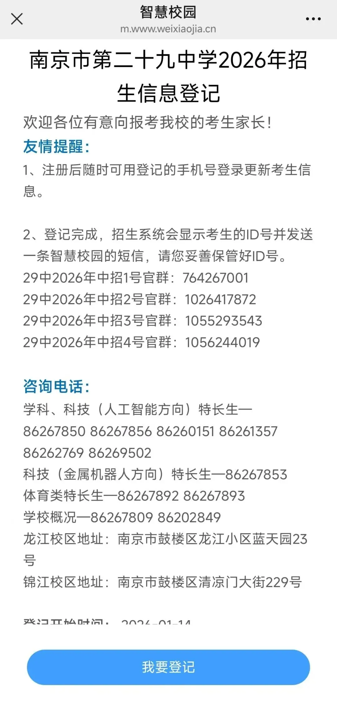 QQ群:QQ1群:1074018357;QQ2群:974091589(1群与2群信息同步,无需重复加群。)1. 微信打开【南京市雨花台中学】公众号 2. 点击信息界面右下角—【招生登记】