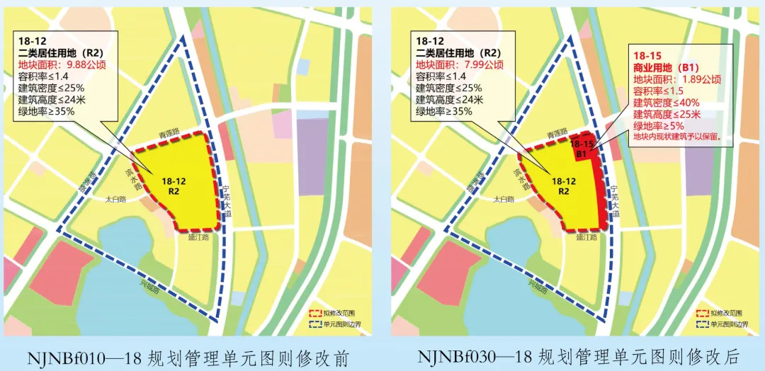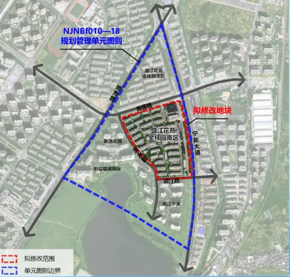 将科研设计用地调整为纯科研用地并配备职工公寓,为的便是“发挥重大科创平台引领效应,促进“中科系”高端创新资源转化,保障省重大项目落地”!据《南京市江宁区滨江新城江宁组团控制性详细规划》NJNBf010—18规划管理单元图则修改(公众意见征询),将从原住宅地块新切分出一部分商业用地。而该地块就位于盛江花苑金桂园南区小区内。规划变更如下: