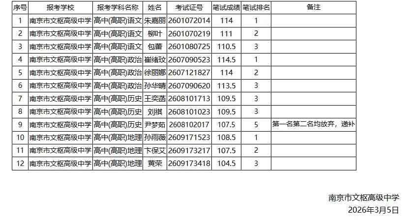 根据《江苏省事业单位公开招聘人员办法》(苏办发〔2020〕9号)文件精神,依据2026年1月9日发布的《南京市秦淮区教育局所属学校2026年1月公开招聘教师公告》秦事招公告〔2026〕1号要求,在南京市秦淮区教育局监督指导下,我校资格复审工作已经结束,朱嘉丽等12人通过资格复审,具备面试资格,具体人员名单及排名附后。