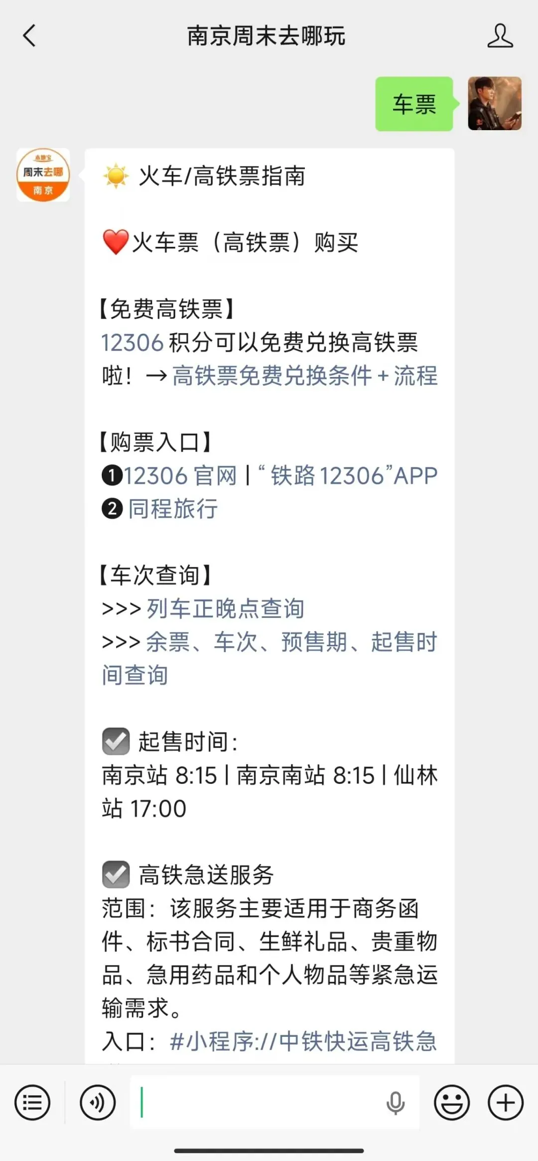 小编提醒:扫描下方二维码,关注【南京周末去哪玩】公众号,私信回复【车票】即可获取车票购买入口、车次查询、抢票时间表、积分兑换高铁票攻略、宠物托运指南等。