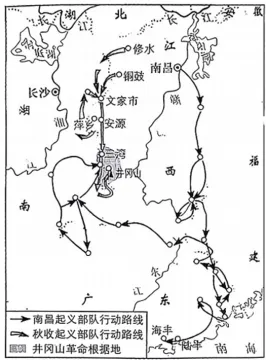 A.中国民族工业失去发展空间B.民族企业规模日益萎缩C.国民政府实业政策无甚成效D.中国工业基础薄弱落后【答案】D根据材料1931年-1934年,中国铁砂产量逐年增加,铁砂及生铁输出量整体呈增长趋势,钢铁消费量总体趋势呈下降趋势,钢铁输入量呈上升趋势,综合表格信息可知中国出口铁砂和生铁较多,对铁的加工能力不足,钢铁进口多,重工业在一定程度上依赖外国,故可知中国工业基础薄弱落后,故D正确;材料只涉及钢铁行业,并不能代表民族工业,故A错误;通过材料无法判断民族企业的规模,故B错误;材料与实业政策无关,故C错误。22.(2021·全国乙卷·高考真题)1934年,毛泽东提出:“我们是革命战争的领导者、组织者,我们又是群众生活的领导者、组织者……在这里,工作方法的问题,就严重地摆在我们的面前。我们不但要提出任务,而且要解决完成任务的方法问题。”当时毛泽东强调改进工作方法意在()【答案】A1934年是国共两党对峙时期,此时毛泽东强调改进工作方法是动员群众拥护共产党,从而参加革命战争,故选A;1927年井冈山革命根据地的创建已经说明中国革命新道路的开辟,排除B;建立广泛的革命统一战线是在1924年国民党第一次代表大会召开以后,1927年随着国民革命的失败已经不复存在,排除C;1934年是局部抗战时期,此时中国社会的主要矛盾是国共两党间的阶级矛盾,因此他并不是在动员社会各界进行抗战,排除D。23.(2021·浙江·高考真题)1931年11月,中华苏维埃共和国宣告成立,成立的地点位于图中的【答案】D其中④是瑞金,因此D正确,①是湖北武汉,②是广西南宁,③是江西井冈山,故排除ABC项。故选D项。24.(2020·江苏·高考真题)1927年11月1日,在时任中共中央农运委员会书记、江苏省委负责人王若飞的组织领导下,宜兴县各路农民队伍举行暴动,宣告成立宜兴县工农兵苏维埃政府。随后江阴、常熟等地共产党人先后暴动予以响应。这一革命斗争重在( )【答案】D1927年中共八七会议确定了开展土地革命和武装反抗国民党统治的总方针,随后毛泽东领导了秋收起义创建了井冈山革命根据地,王若飞在江苏领导的农民武装暴动,这些斗争都在探索建立农村革命根据地,开创农村包围城市最后夺取政权的革命道路,故选择D项;1927年蒋介石和汪精卫分别制造了四一二政变和七一五政变,标志着国民革命运动失败,排除A项;1927年八一南昌起义标志着武装夺取政权的开始,排除B项;王若飞是农运委员会书记,领导的是农民队伍暴动,排除C项。25.(2014·全国·高考真题)下表是国民政府中央农业试验所的一组全国性抽样调查数据 | 佃农(%) | 半佃农(%) | 自耕农(%) |