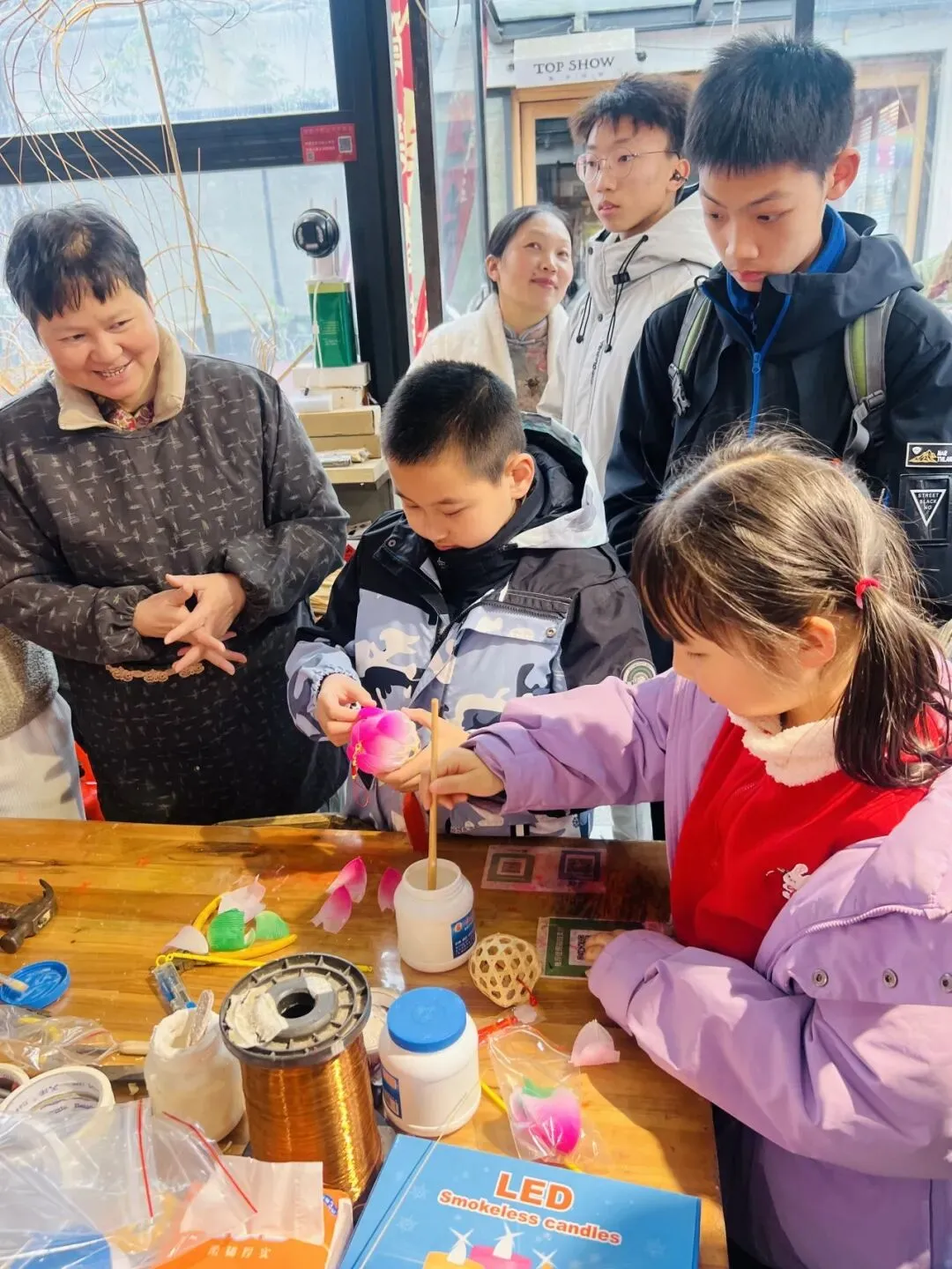 从秦淮•非遗馆出来不远,就到达了马道街“秦淮灯彩”顾业亮大师工作室。工作台上“马踏飞燕”等栩栩如生的马年生肖花灯烘托出浓浓的年俗氛围。顾业亮出生灯彩世家,8岁跟随父亲学艺,专业制作秦淮灯彩50多年,多项作品获大奖。他还曾先后走访50多个国家和地区进行文化交流。顾业亮以最经典的荷花灯为例,手把手教大家花灯的制作方法:他首先把十来张染好的花瓣纸缠在特制的木棍上,用铜丝均匀缠绕,随后利用模具进行压模,在压模工具的作用下,缠绕铜丝的纸上,形成了一道道均匀精致的经络。随后顾业亮用嘴巴对着被按压紧实的花瓣吹气,利用巧劲把层层花瓣吹开间隙,又进行分片、卷曲,最后用浆糊粘贴在花灯的骨架上,很快一盏栩栩如生的荷花灯便展示在大家面前。