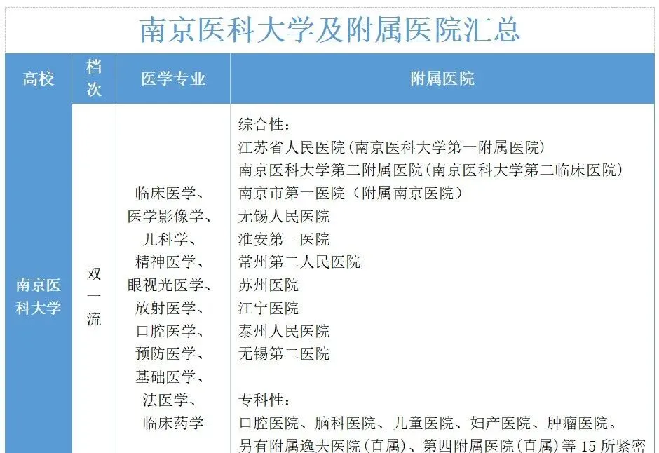 | 南京医科大学 | 临床医学(A类)、公共卫生与预防医学(A+)、口腔医学、儿科学 - | “天元卓越班”:拔尖创新人才培养;5+3一体化:本硕贯通,注重临床实践与科研融合 - | 保研率约15%,深造率56%以上,临床医学专业升学率高达83%。江苏省内医疗系统就业绝对优势,附属医院网络强大 |